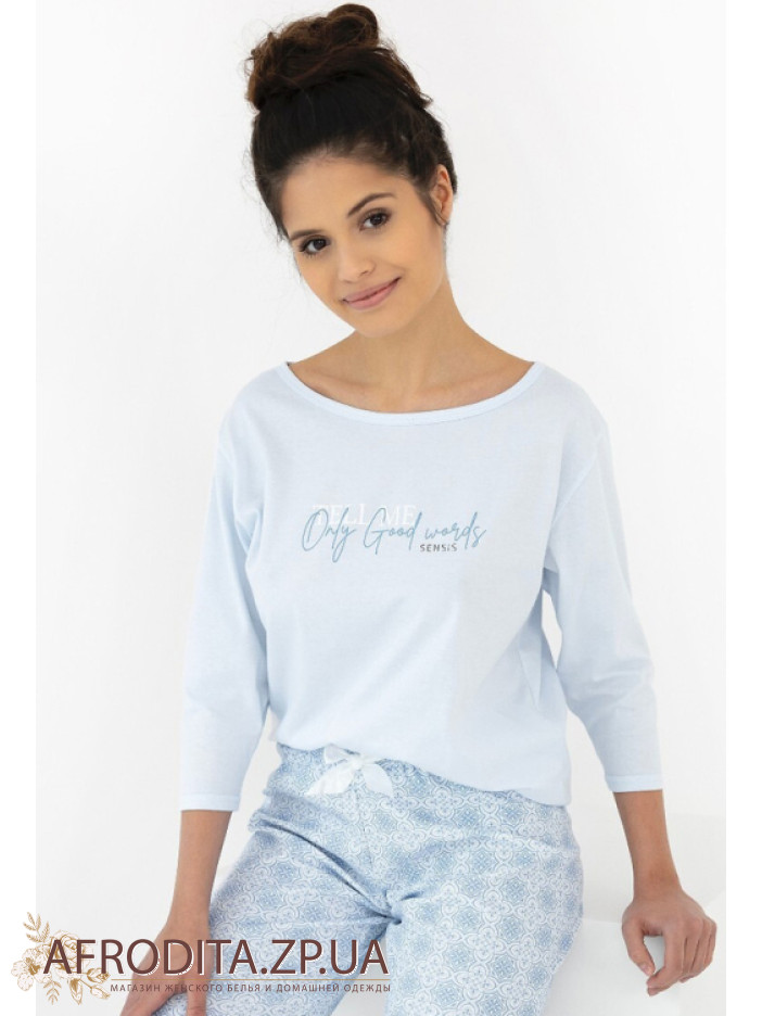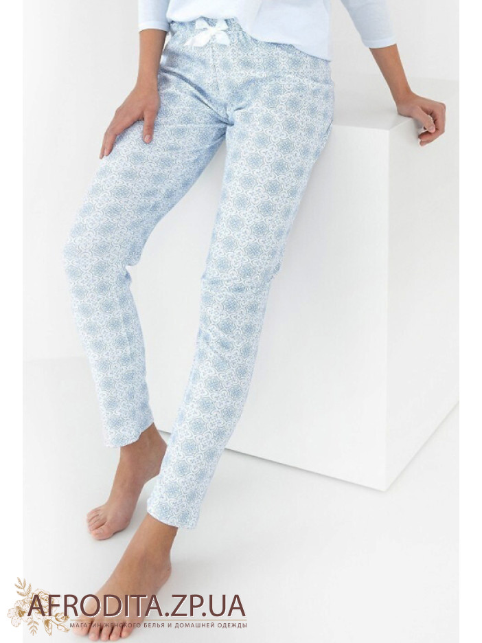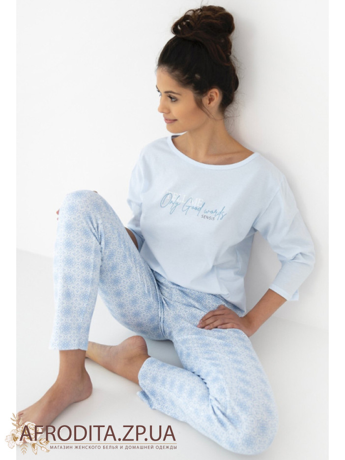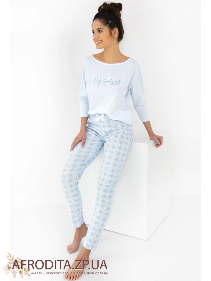 Жіноча піжама зі штанами Sensis Marina виготовлена з високоякісної бавовни. У комплект входить кофта вільного крою з рукавом 3/4 та округлою горловиною та штанів на гумці трохи звужені до низу та атласним бантиком по центру.