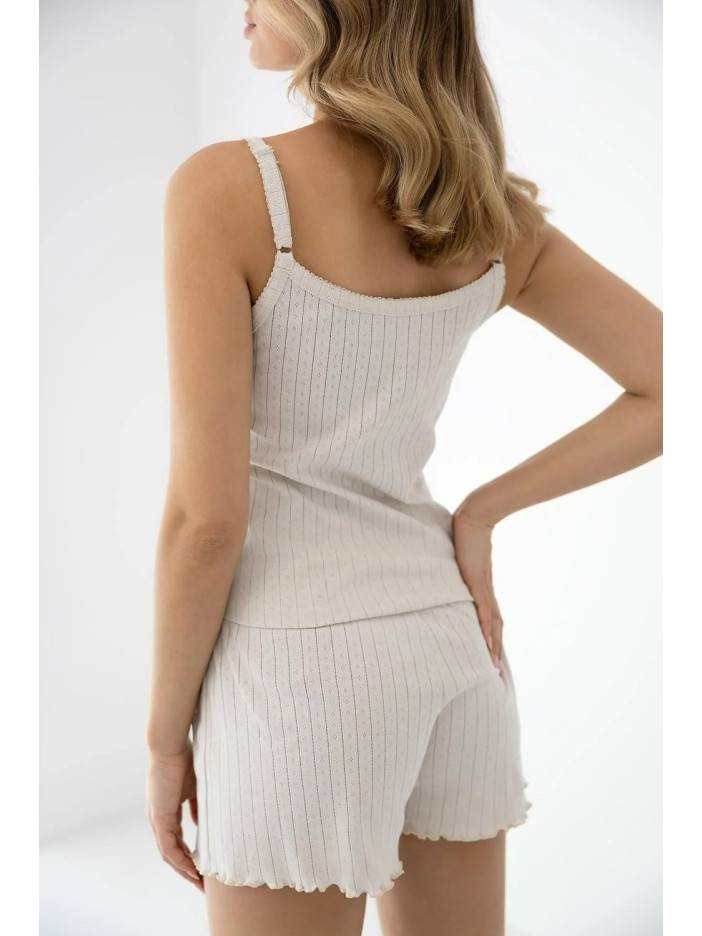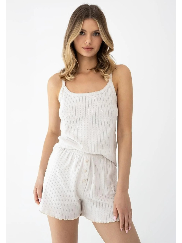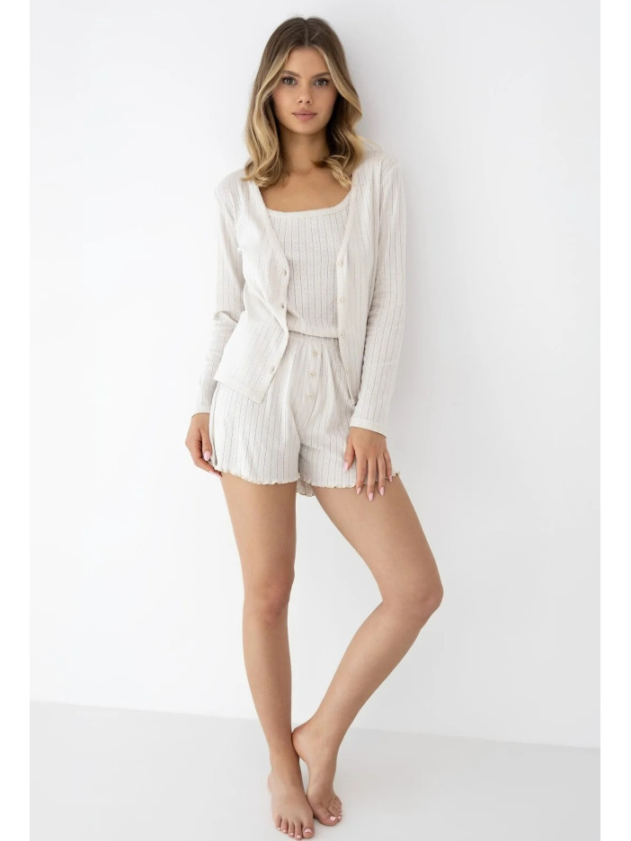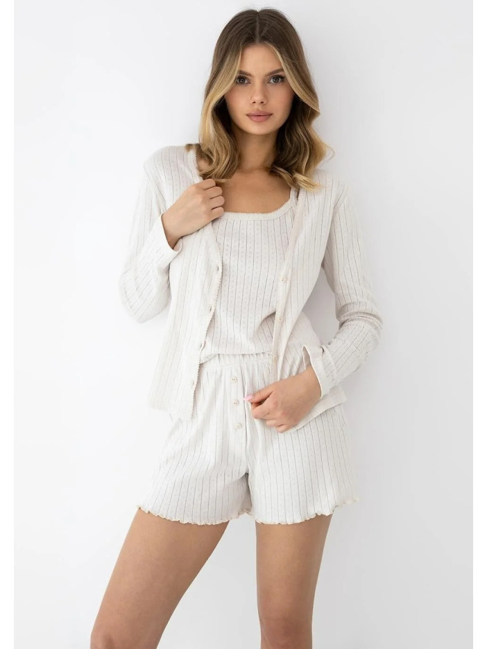Комплект з трьох предметів включає класичну майку, зручні шорти і легкий кардиган з довгими рукавами. Тканина має ніжну вертикальну смужку з ажурними деталями, що надають піжамі легкого та романтичного характеру. Майка, оброблена естетичною окантовкою, має класичний крій, що ідеально облягає фігуру. Зручні шорти із високою талією, прикрашені стильними гудзиками спереду. Брюки оздоблені чарівним хвилястим краєм (салатний край). Практичний кардиган, що застібається на маленькі гудзики в тон, можна накинути поверх нього прохолодним ранком або носити окремо.