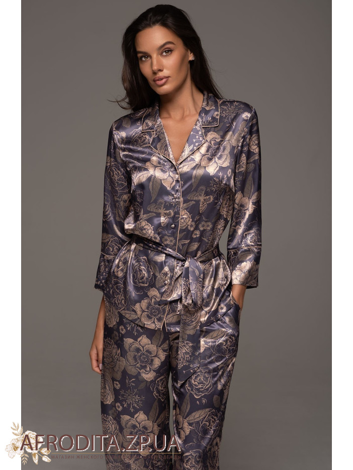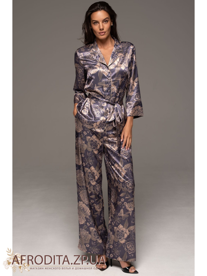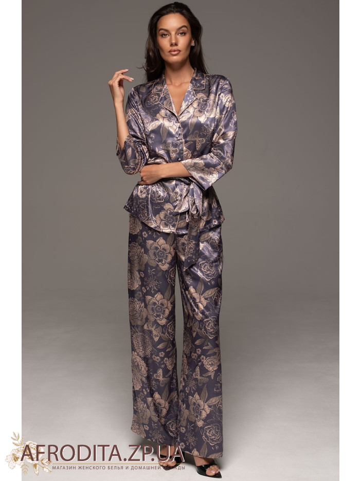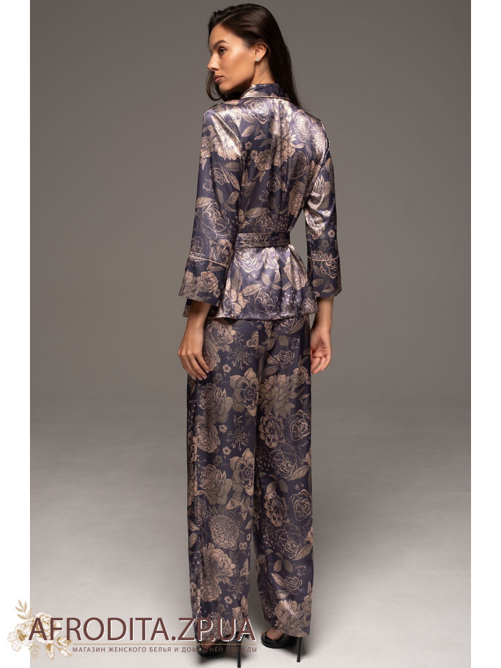 Брючний комплект Джаконда 4686 від Mia-Amore із змішаного полотна. Складається з жакету та штанів. Жакет на ґудзиках, з рукавами довжиною 7/8, на рукаві широкі манжети. Штани довгі, з кишенями в бічних швах, низ штанів з широкими манжетами. Жакет та штани декоровані оздобленням у вигляді канта. Комплект доповнений поясом.