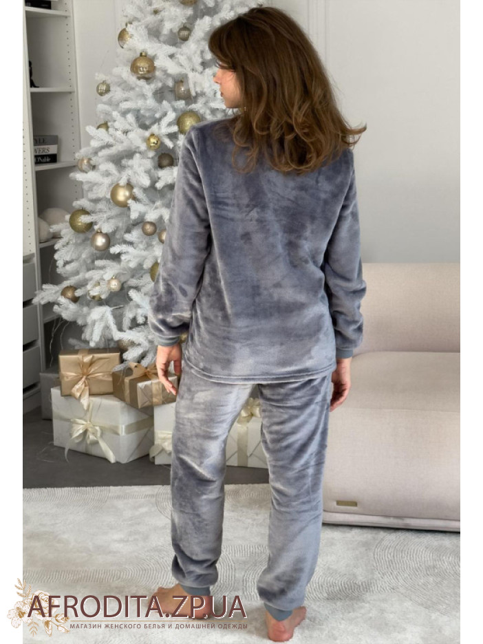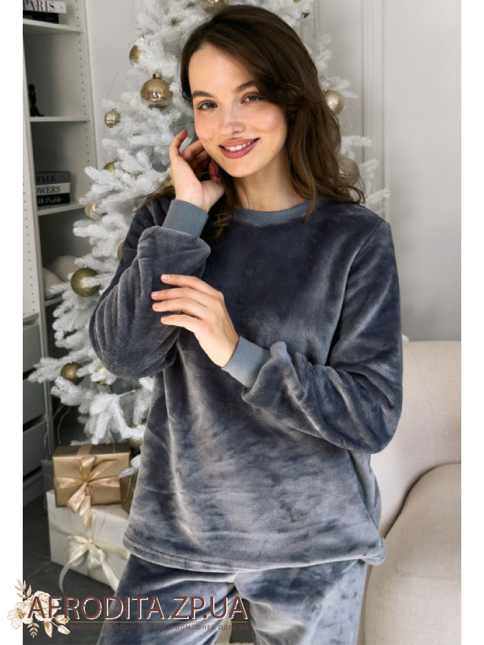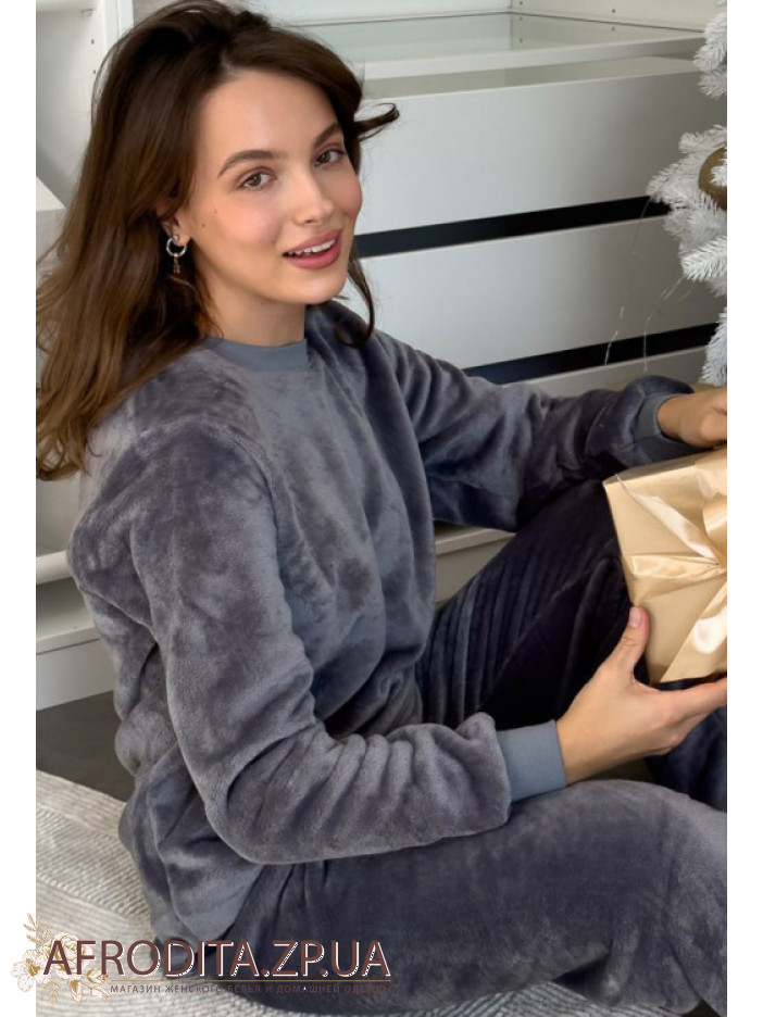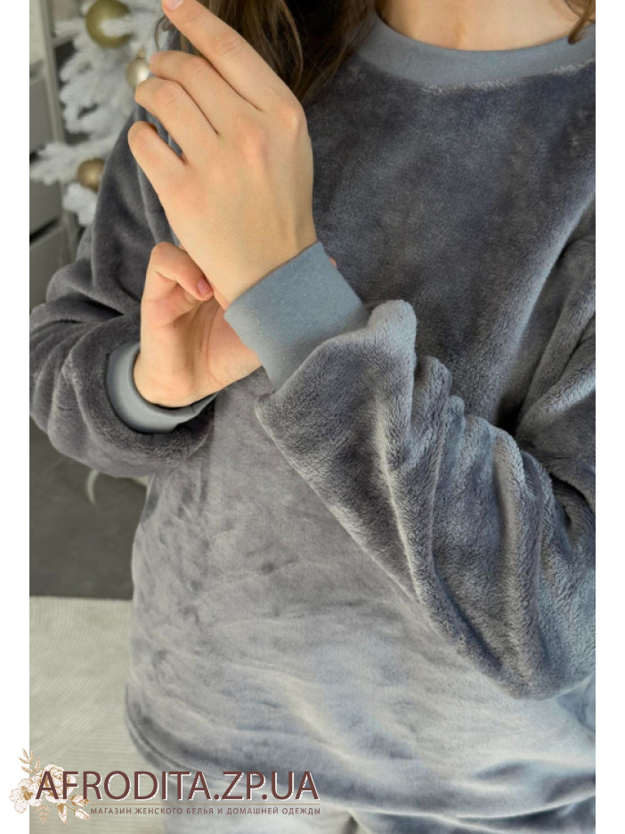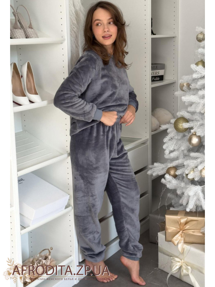 Жіноча тепла піжама з м'якого та теплого флісу від українського бренду Cosy. Модель представлена у сірому кольорі. Комплект складається з джемпера вільного крою м довгими рукавами та манжетами, горловина кофти має округлу форму. Штани вільного силуету на резинці на поясі, знизу оброблені манжетами. Піжама зігріє в холодну пору і відмінно підійде як подарунок близьким вам людям.