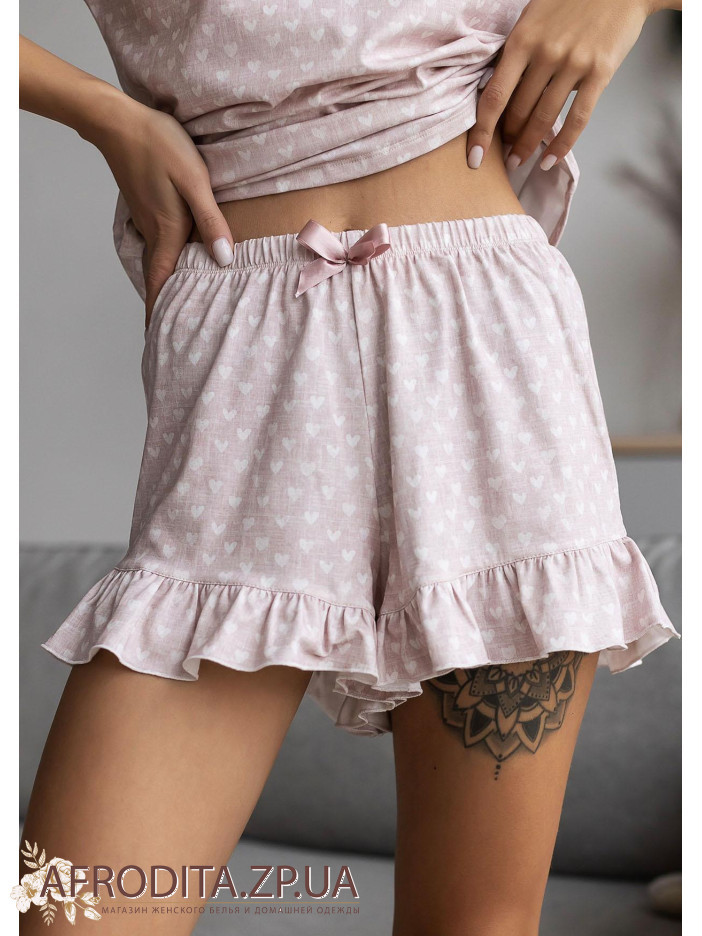 Жіночий домашній комплект 1575-16504 із трикотажної тканини. Піжама складається з футболки з коротким рукавом та шорт на гумці. Нагорі шорт какетливий бантик.