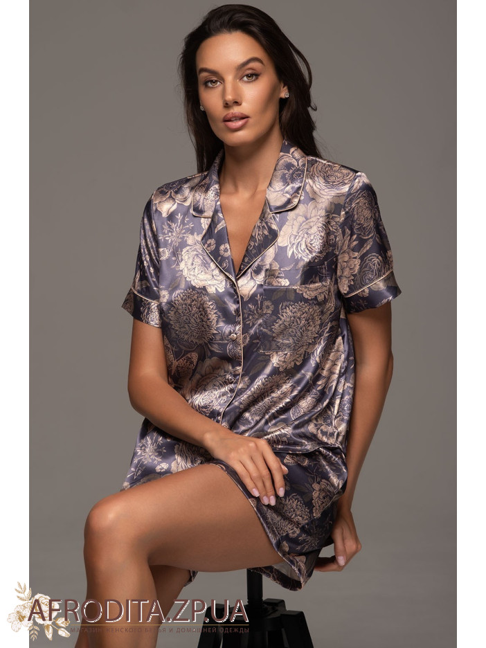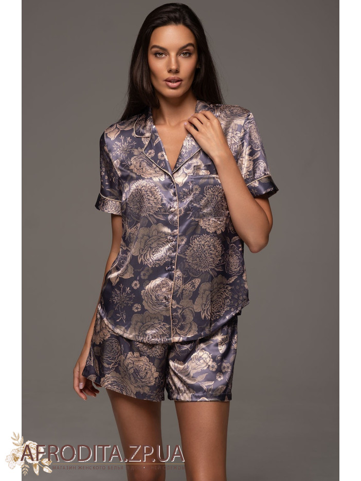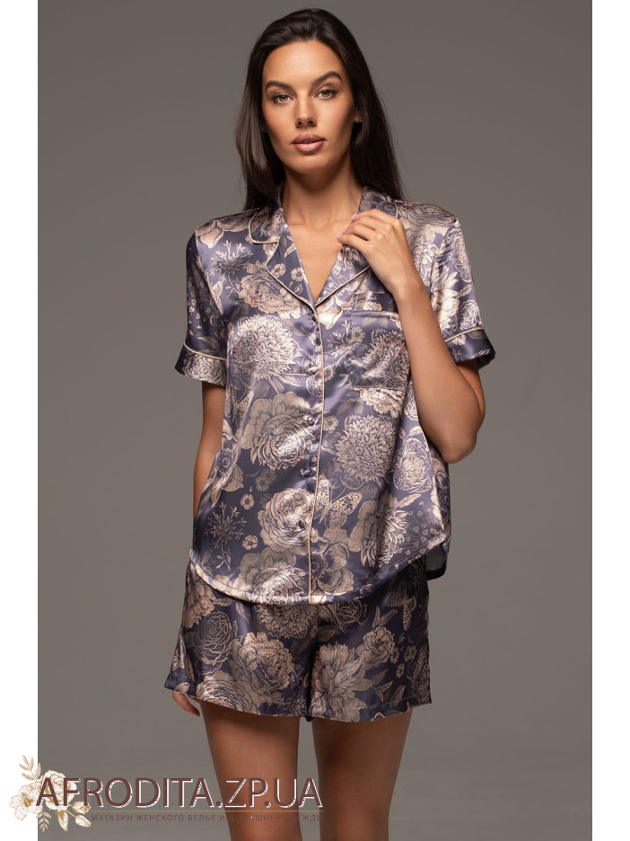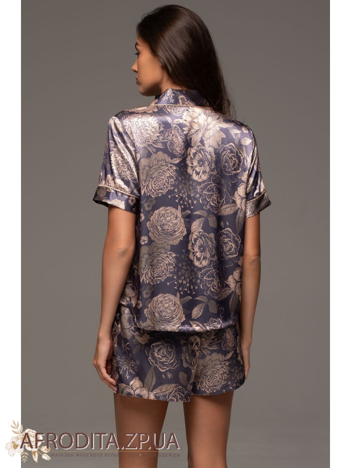 Жіночий домашній комплект Джаконда 4684 від Mia-Amore. Модель складається з сорочки вільного крою з коротким рукавом та шорт на резинці в області талії. Комплект виконаний з шовкового полотна з контрастними кантами. З обох боків шорт оброблені кишені. В області декольте з лівого боку розташована накладна кишеня.