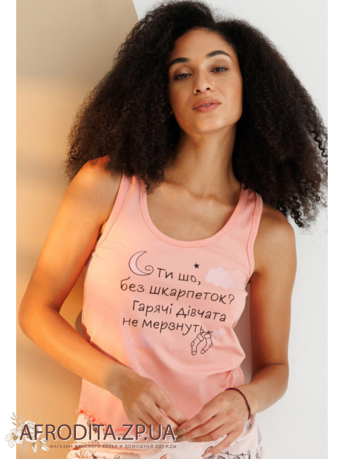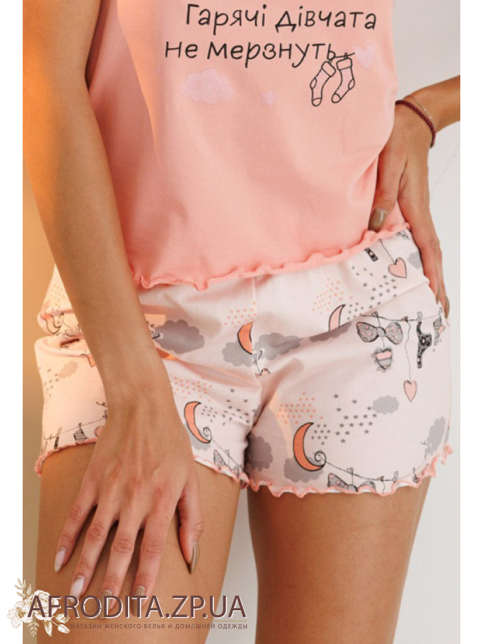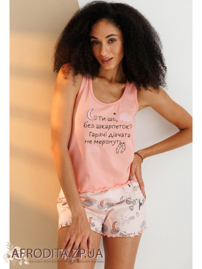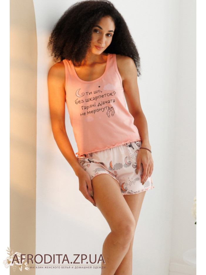 Жіночий домашній комплект із високоякісної бавовни від українського бренду Roksana. Піжама складається з майки на широких бретелях, спереду прикрашена принтом. Шорти короткі на резинці. Модель дуже практична і приємна до тіла і може бути чудовою ідеєю для подарунка близькій вам людині.