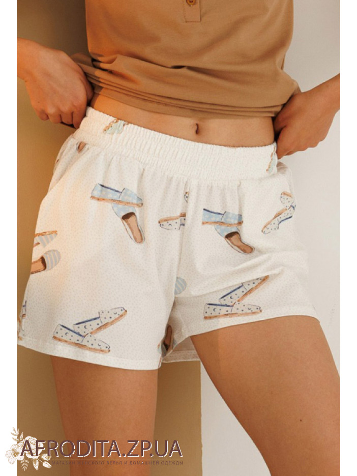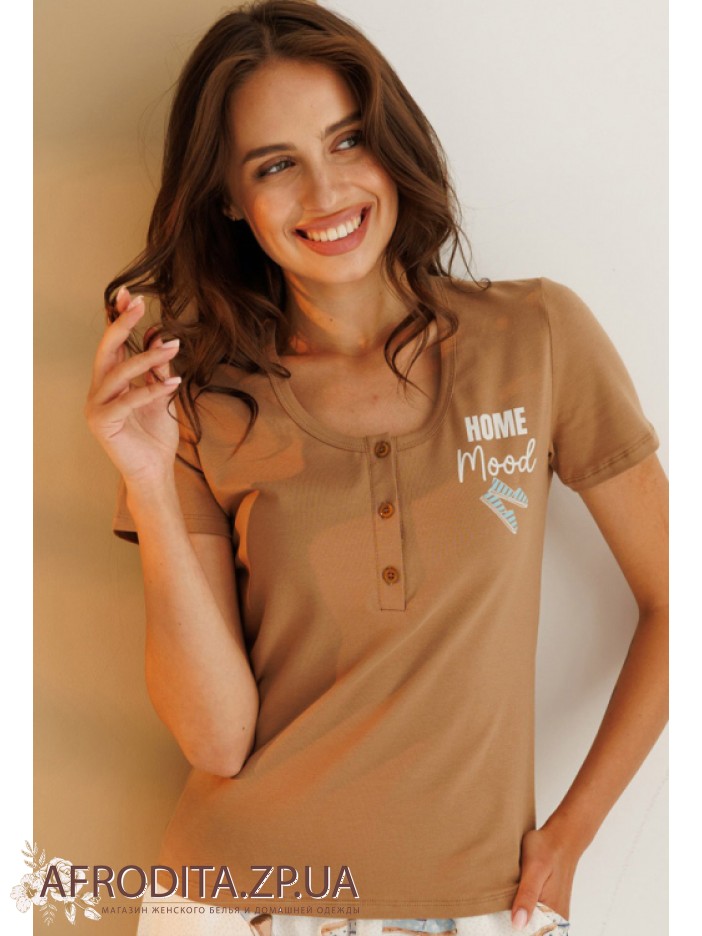 Жіночий домашній комплект із бавовни від українського бренду Roksana. Піжама складається з футболки з короткими рукавами, горловина має округлу форму. В області декольте розташовані гудзики. Зліва на грудях написи "Home Mood". Шорти на м'якій резинці на поясі. Модель виглядає дуже молодіжним і відмінно підійде для подарунка.