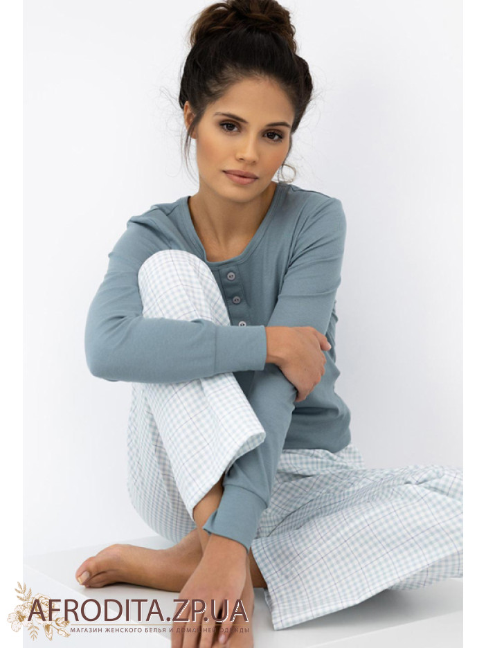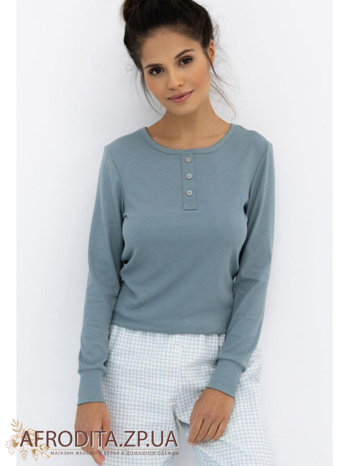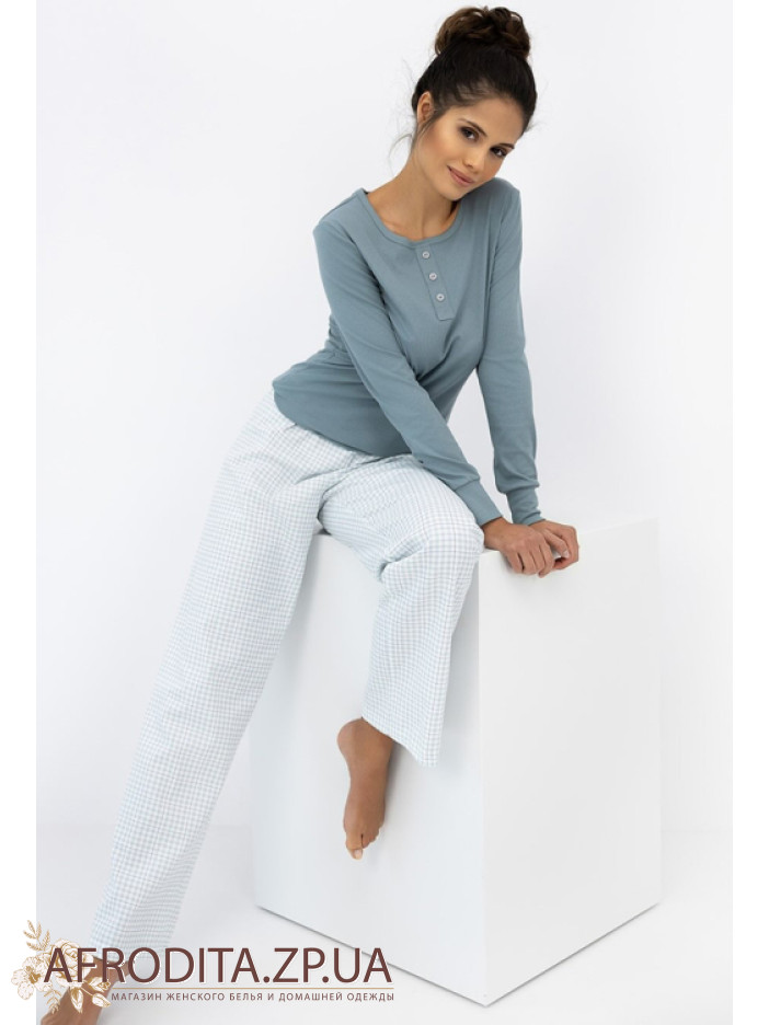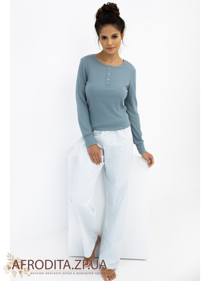 Жіночий домашній комплект із бавовни Sensis 82643 виробництво Польща. Піжама складається з джемпера в рубчик сіро-блакитного кольору, модель з довгими рукавами, горловина має округлу форму, в області декольте як декор розташована планка з гудзиками. Штани прямого крою на гумці з геометричним принтом.
