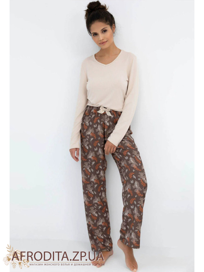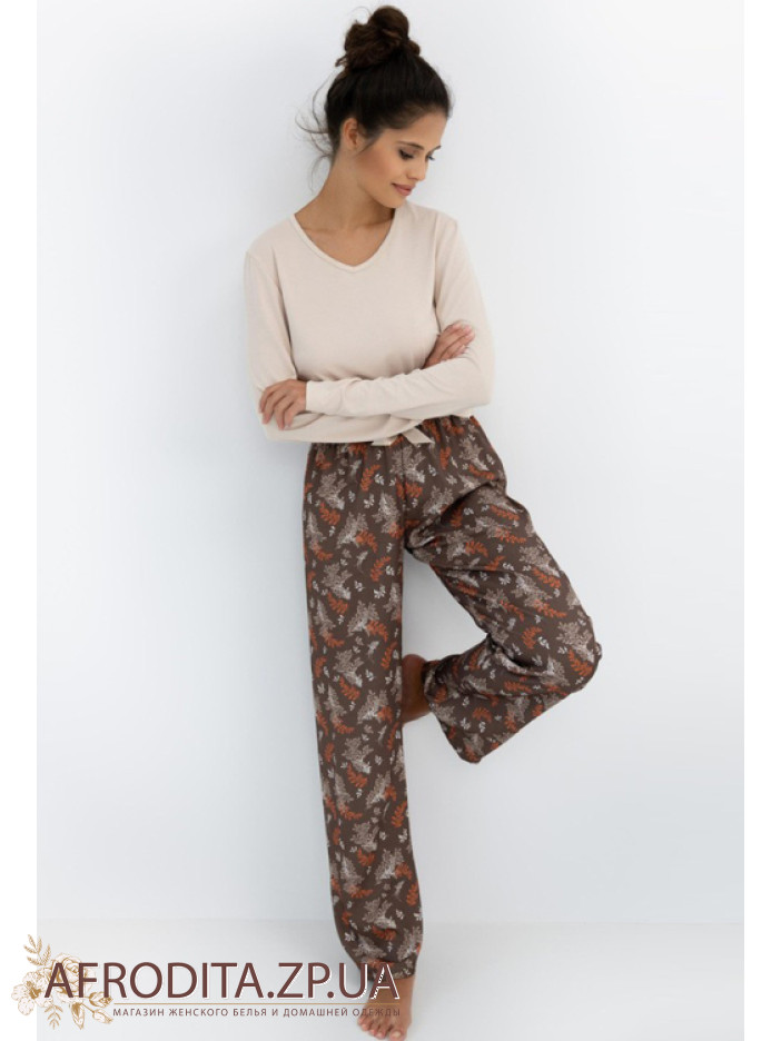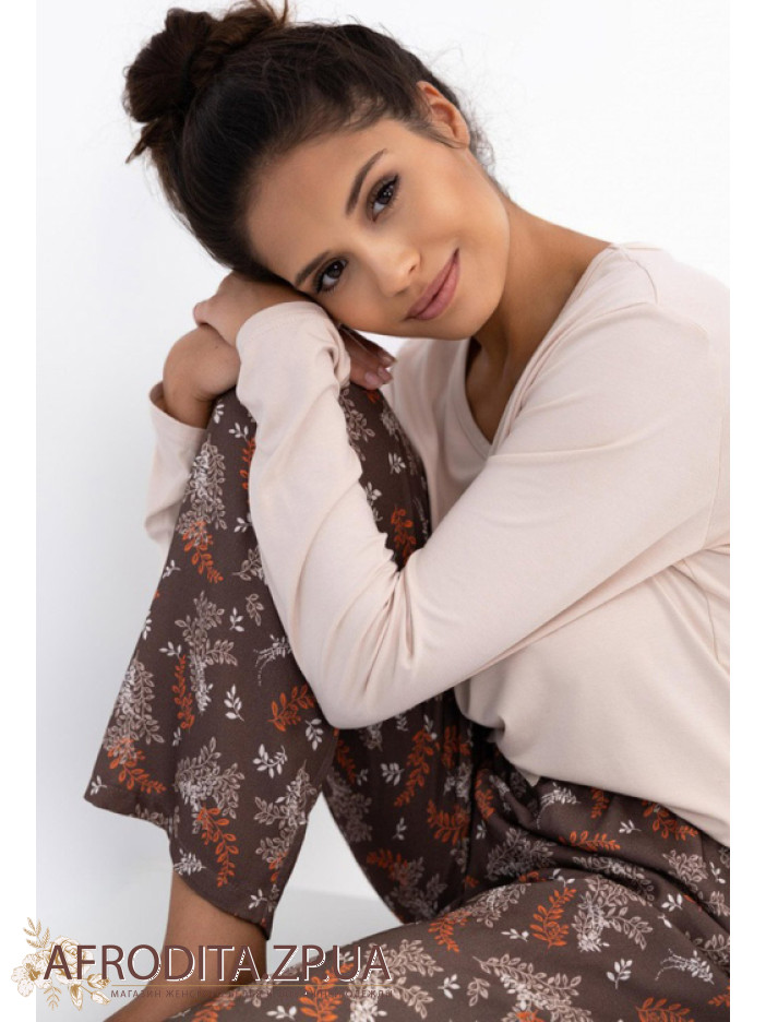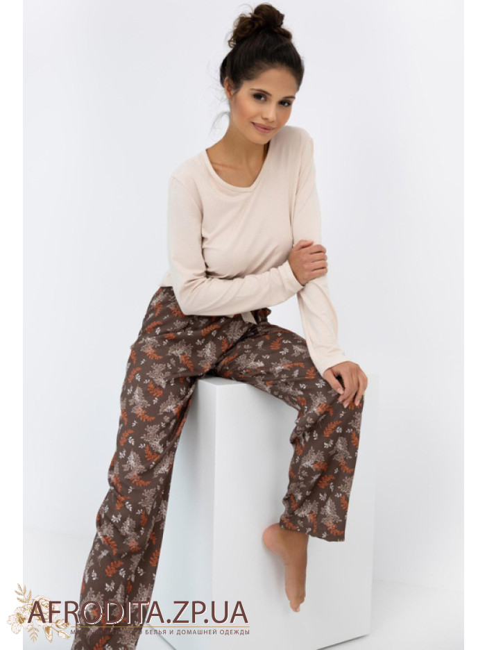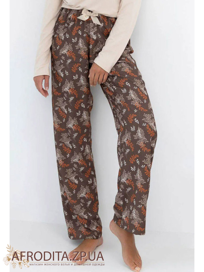 Жіночий домашній комплект Sensis Shelby з м'якої та дуже приємної до тіла віскози. Піжама складається з однотонного джемпера вільного крою з довгими рукавами, горловина має V-подібну форму. Штани прямого крою на гумці в талії. Штани коричневого кольору із принтом. На поясі розташований кокетливий бантик. Модель виглядає дуже стильно і чудово підійде як подарунок близьким вам людям.