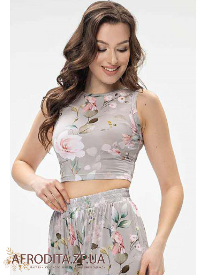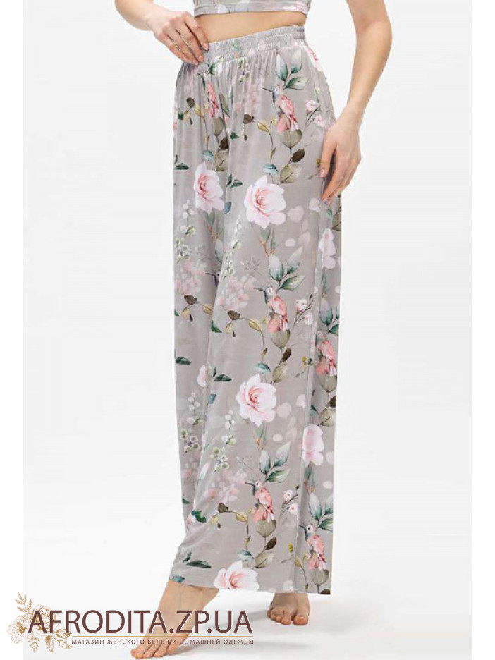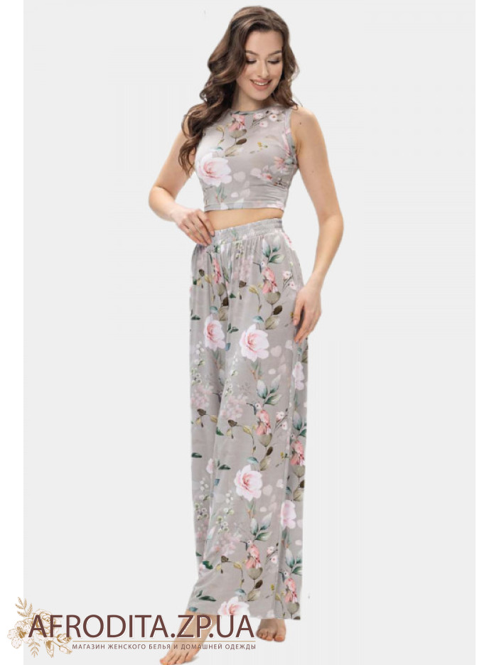 Жіночий домашній комплект Shato 2419 сірого кольору з квітковим принтом із ніжної віскозної тканини. Піжама складається з топу прилеглого силуету та штанів на гумці вільного крою.