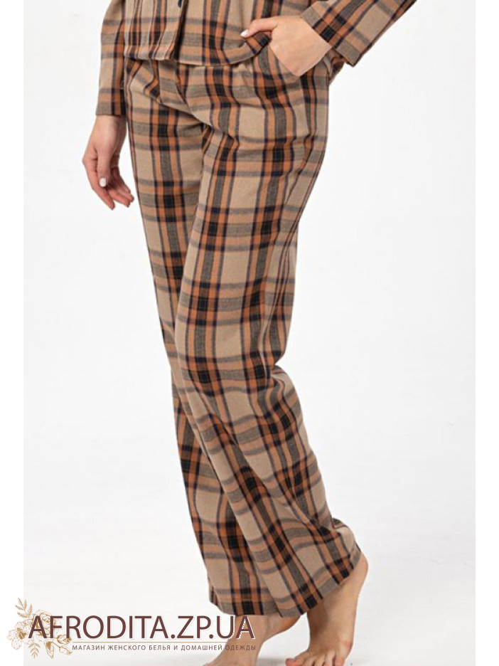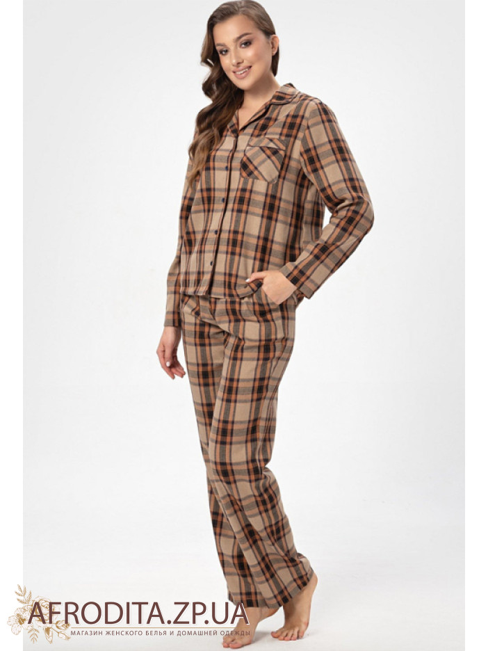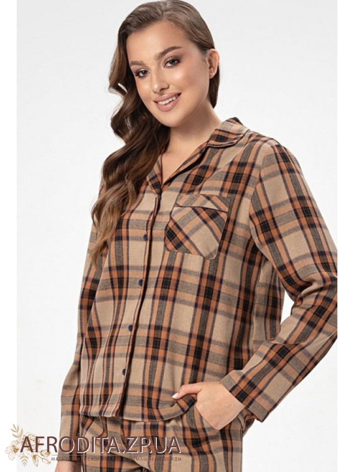 Жіночий домашній комплект в принт Shato 2524 від українського бренду виготовлений з м'якої фланелі. Піжама складається з сорочки з довгими рукавами, яка застібається на гудзики. На грудях як декор розташована накладна кишеня. Штани прямого крою на гумці, з боків розташовані кишені. Піжама дуже м'яка та приємна до тіла.