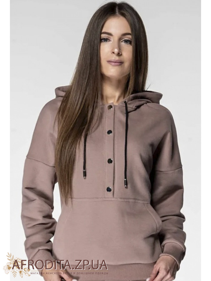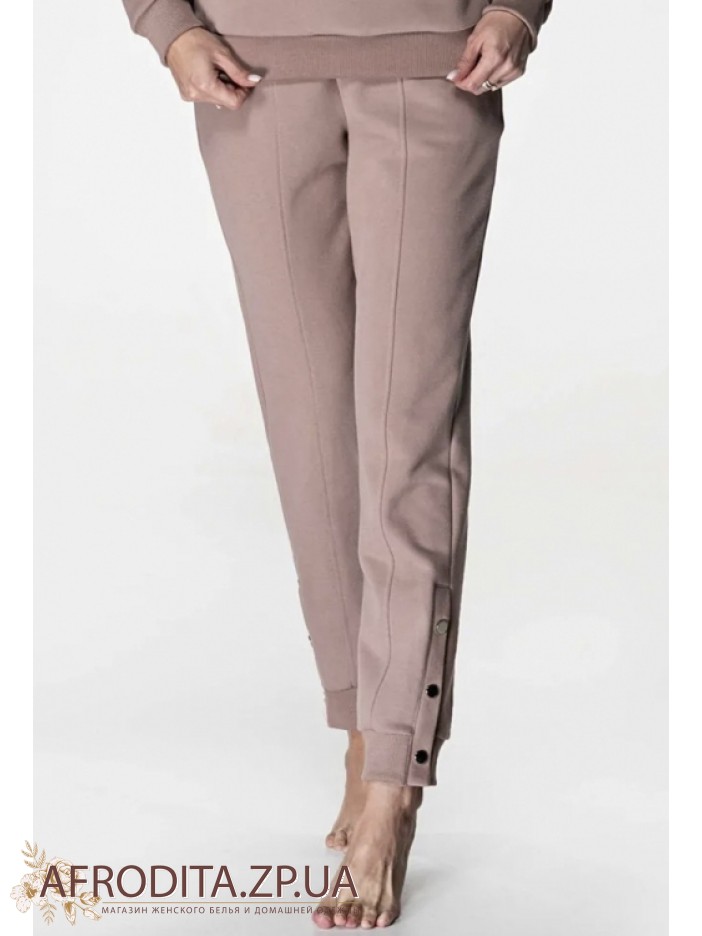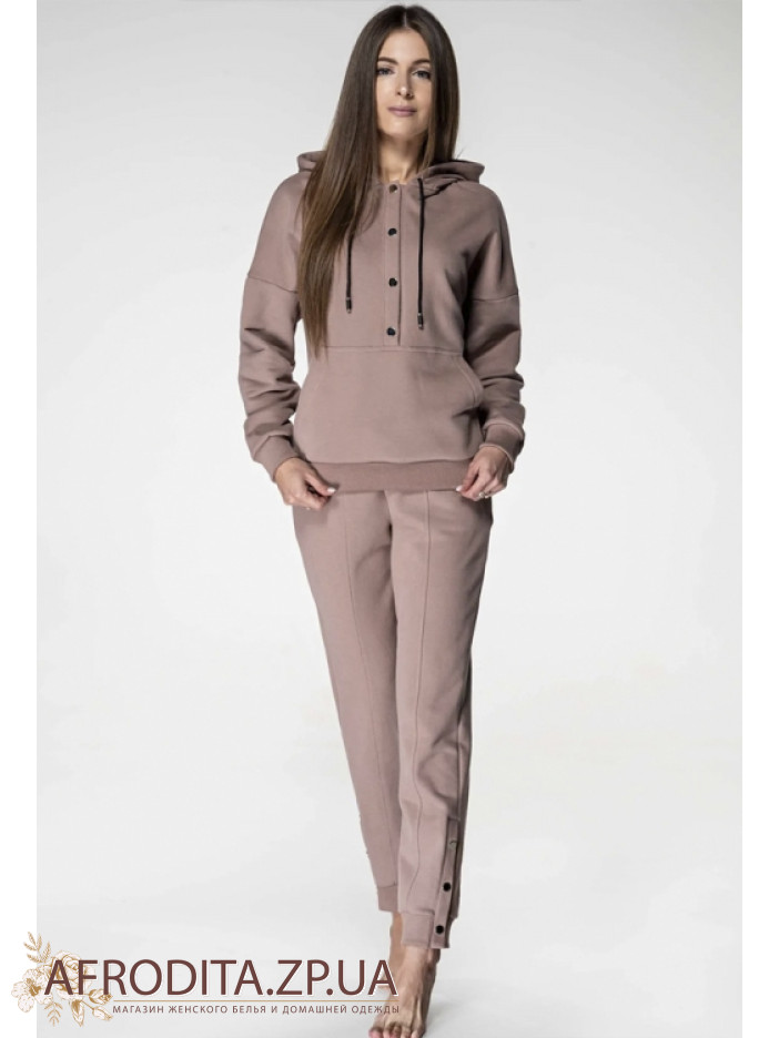 Жіночий комплект зі штанами Wiktoria 1115 виготовлений з теплої та дуже приємної до тіла бавовни. У комплект входить худі з капюшоном та довгими рукавами, з боків розташовані кишені, штани на резинці прямого крою. Область горловини на толстовці та нижня частина штанів застібається на кнопки.