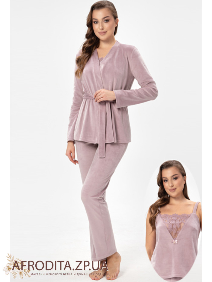 Жіночий комплект трійка Shato 2525 виготовлений з м'якого та приємного до тіла велюру. Комплект складається з майки на тонких бретелях, що регулюються, глибокий V-подібний виріз декольте прикрашений мереживною вставкою. Жакет із довгими рукавами на запах, у комплекті є пояс для регулювання лінії талії. Штани прямого крою на резинці.