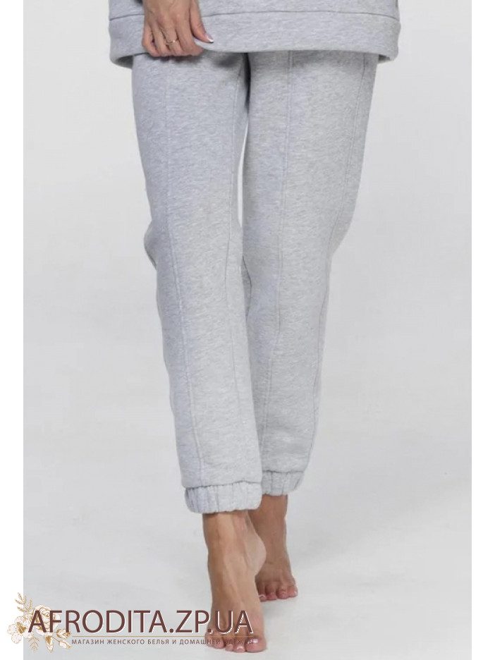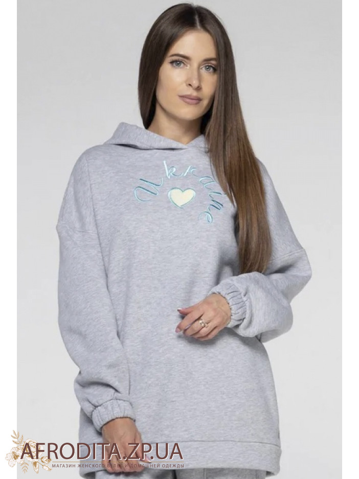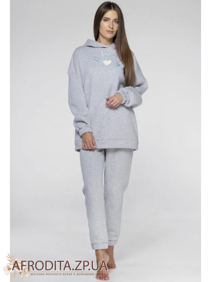 Жіночий теплий костюм Wiktoria 1311 сірого кольору з високоякісної бавовни. Комплект складається з джемпера з капюшоном та довгими рукавами. Штани прямого крою на резинці.
