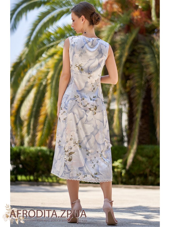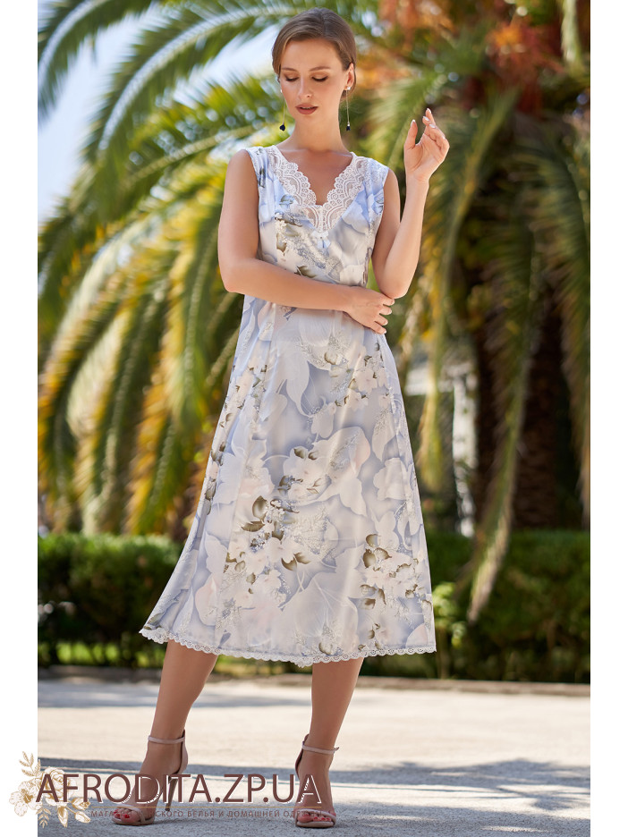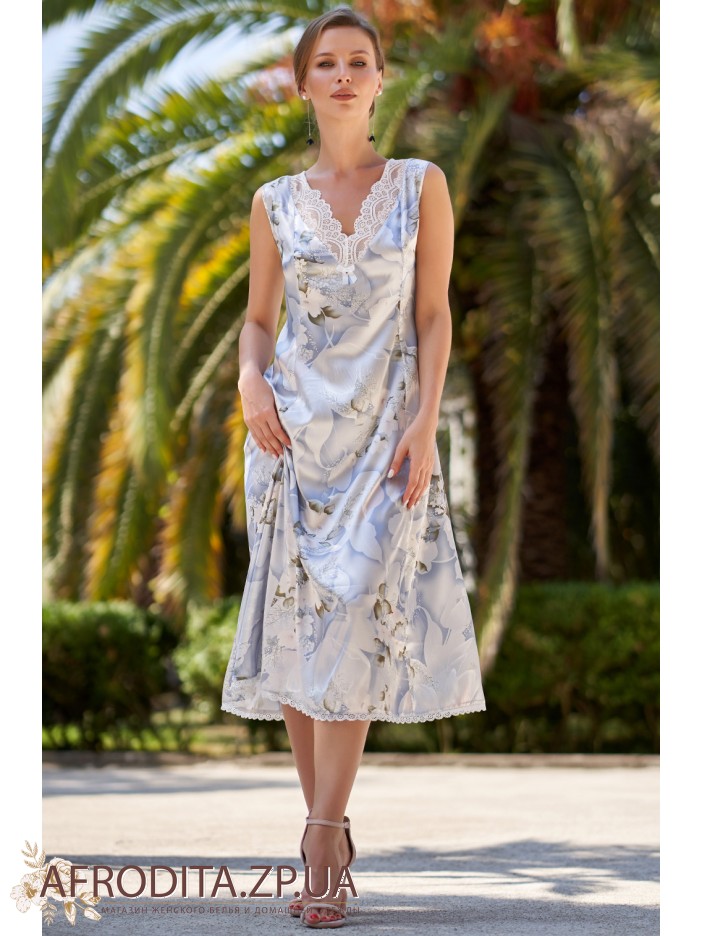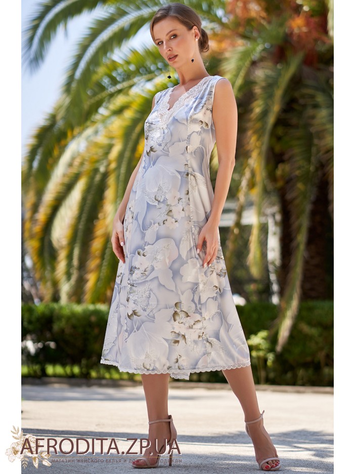 Довга сорочка "Новела" 3608 від Mia-Amore з V-подібним вирізом, виконана з принтованого смесового шовку. Виріз і низ сорочки декоровані ажурним мереживом. Ліф прикрашений бантиком з підвіскою.