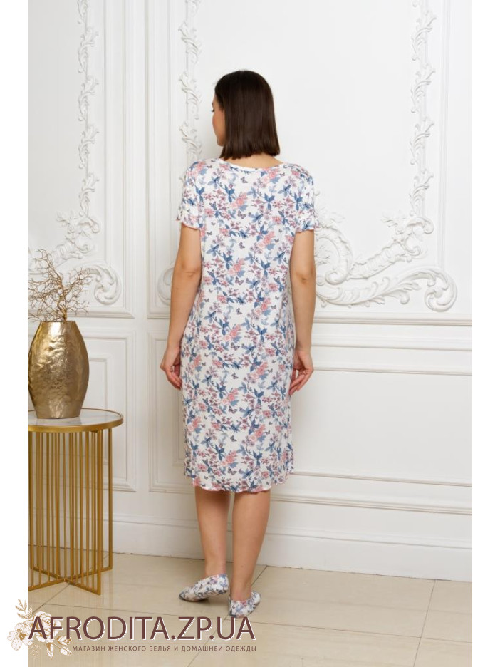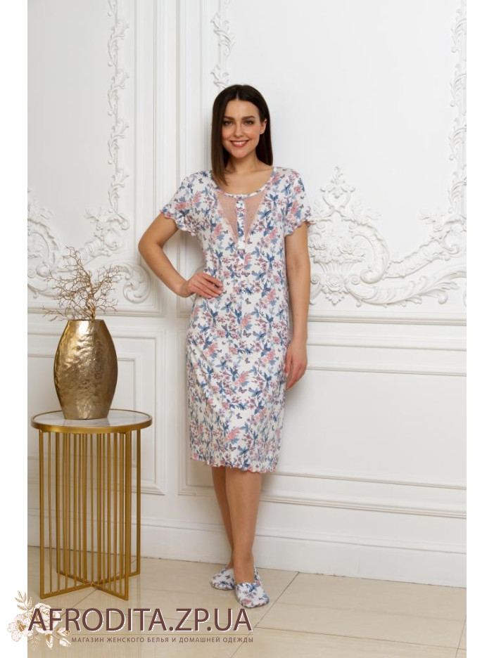 Ніжна жіноча нічна сорочка ТМ Emmi. Сорочка виконана з високоякісної віскози, прінтована квітковим візерунком. Модель вільного крою, з коротким рукавом, довжиною трохи нижче коліна, по центру планка і атласний бантик. В якості прикраси горловина прикрашена кокетливим ажурним мереживом. Сорочка дуже красива і комфортна, можна використовувати як одяг для дому.