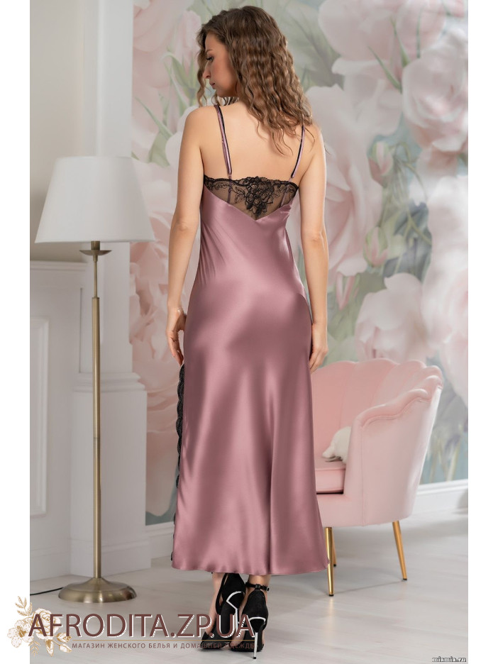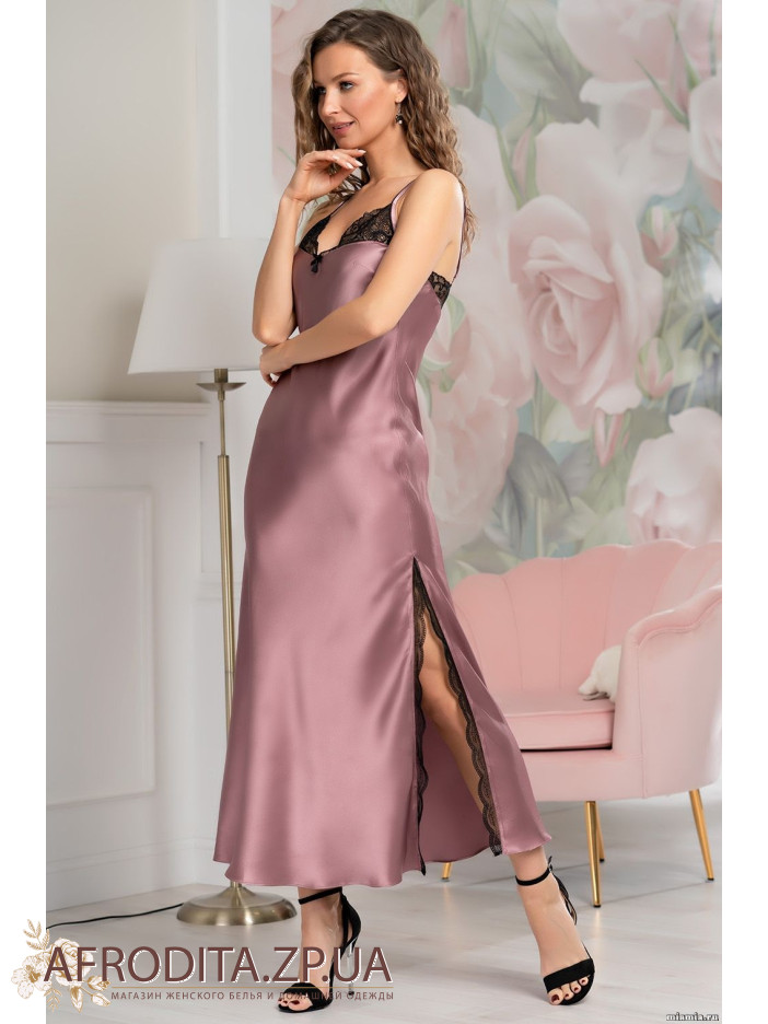 Довга сорочка Mia-Amore з V-подібним вирізом, виготовлена з однотонного сумішевого шовку. Верх декольте, розрізу та спинки сорочки декоровані мереживом. Ліф прикрашений бантиком із підвіскою.