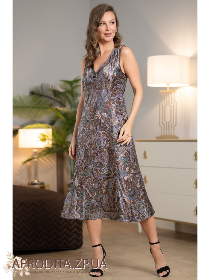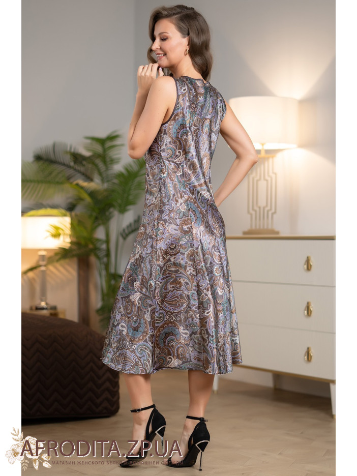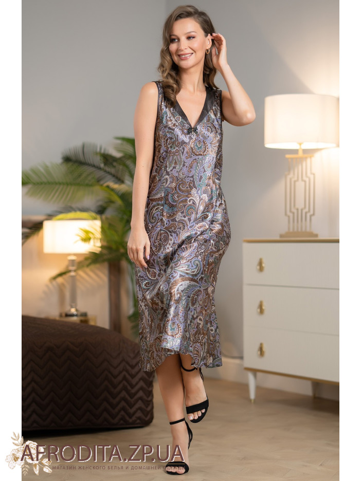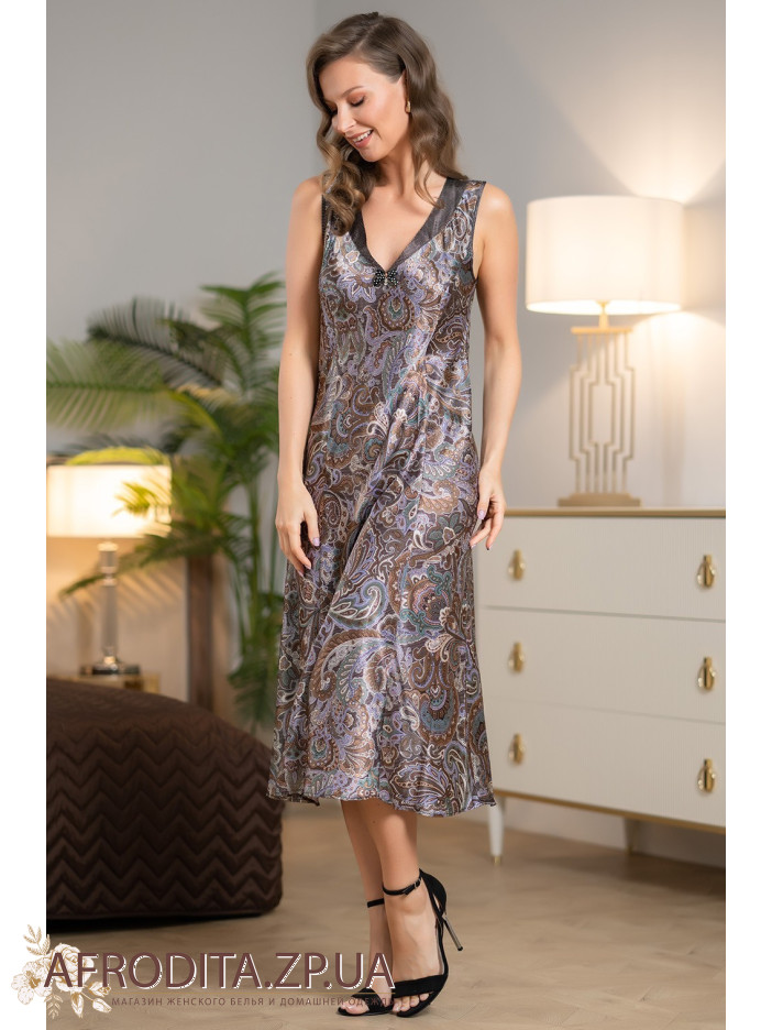 Довга елегантна сорочка Джина 3817 від Mia-Amore напівприлеглого силуету на широких бретелях, виготовлена з принтованого шовку і доповнена оздобленням з тканини компаньйона. Центр вирізу прикрашений атласним бантиком із підвіскою.