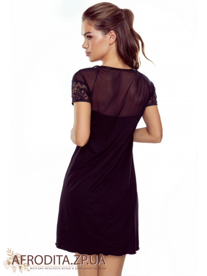 Нічна сорочка з віскози Eldar 234371 від польської торгової марки, виготовлена з віскозного полотна. Сорочка довга вище колін з підрізом під грудьми. Область декольте та рукави сорочки виготовлені з мереживного полотна, горловина має округлу форму. Спинка виробу декорована напівпрозорою сіткою, що надає неповторного шарму. Ночнушка виглядає сексуально і може бути відмінною ідеєю для подарунка близькій вам людині.