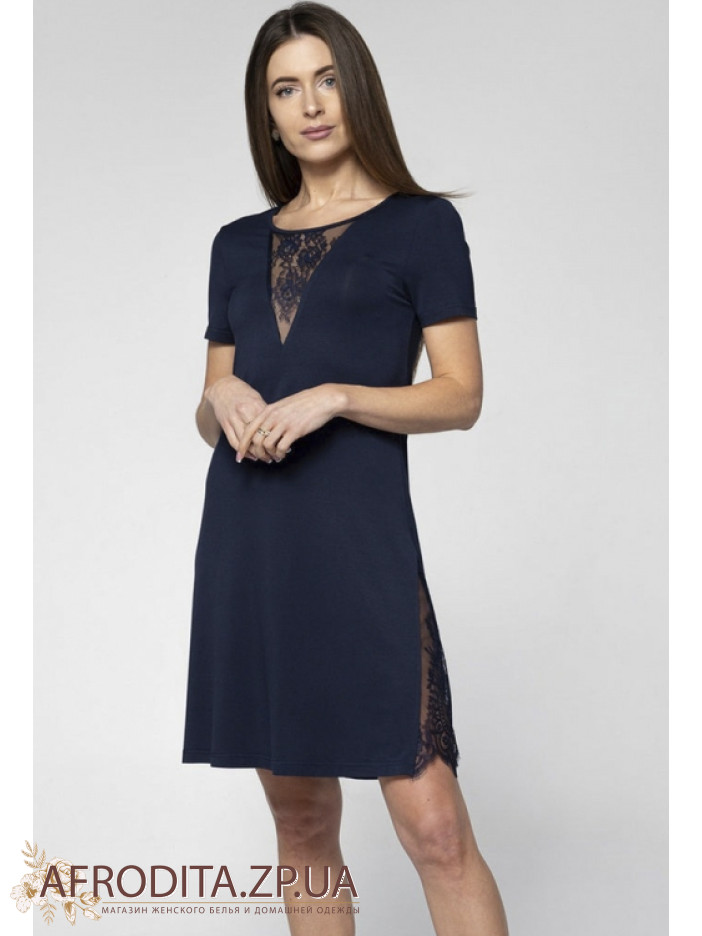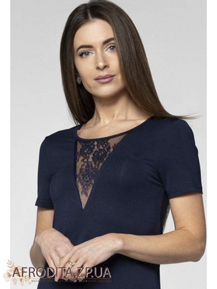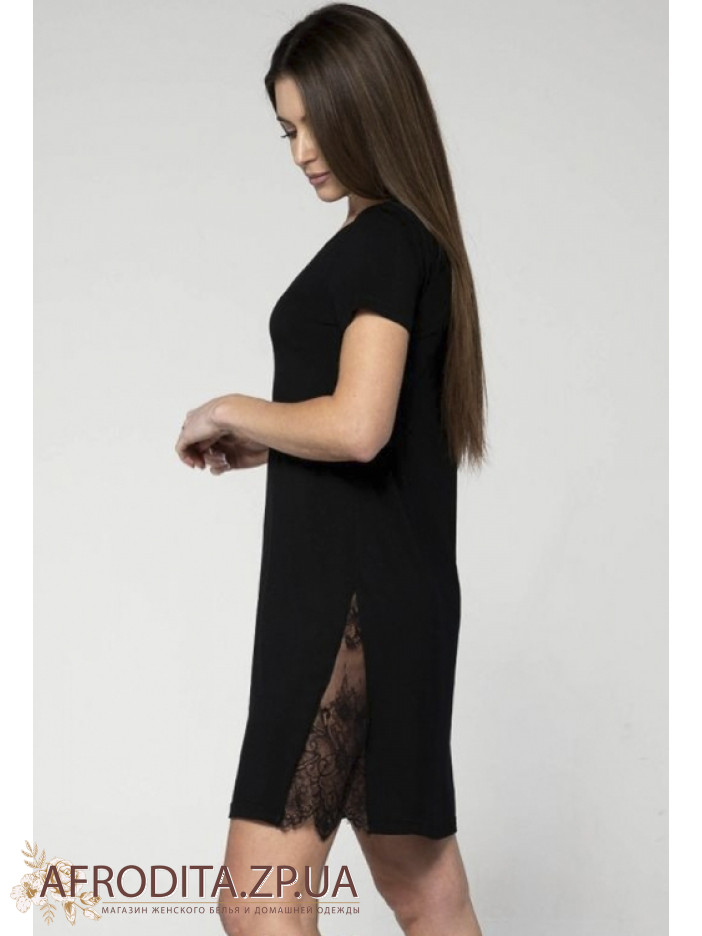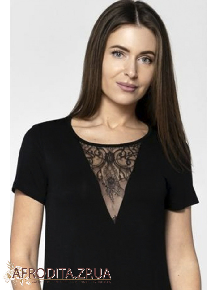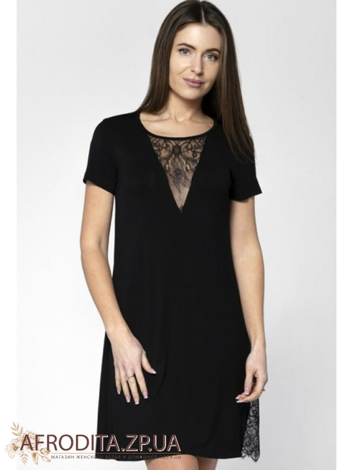 Нічна сорочка вільного крою з віскози Shato 2226 Ніч довжиною вище колін з короткими рукавами, глибокий V-подібний виріз декольте декорований напівпрозорим мереживом, бічні розрізи виробу також прикрашені вставками з мережива.