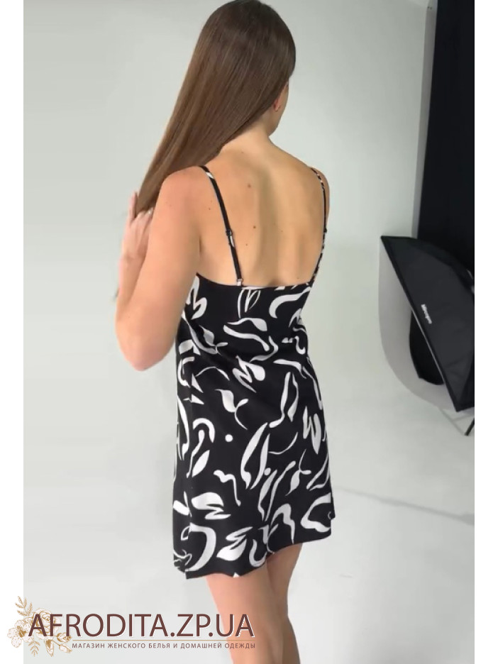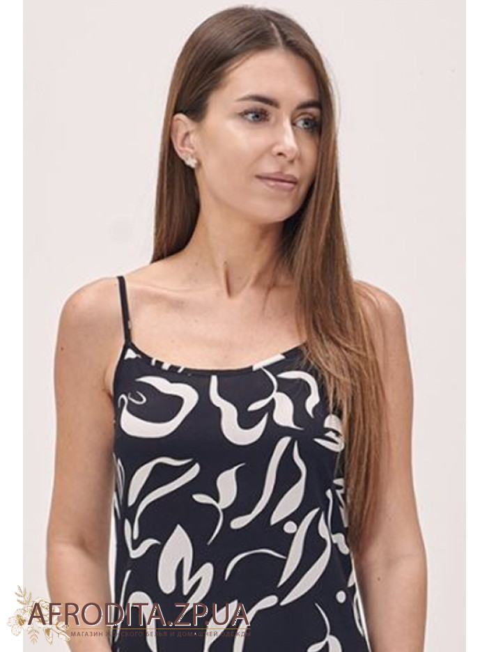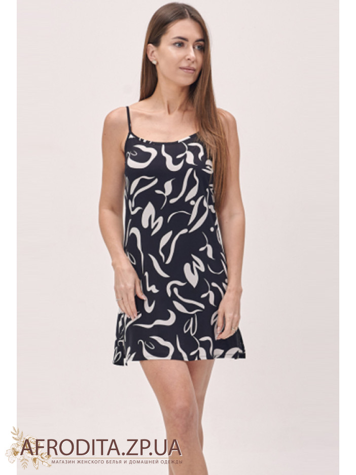 Нічна жіноча сорочка 2635 від української торгової марки Shato виготовлена із трикотажної тканини на основі бавовни. Сорочка вище колін на тонких бретелях, що регулюються. Модель без підрізу під грудьми із округлою формою вирізу декольте. Білий фантазійний принт на чорному тлі надає моделі неповторної особливості.