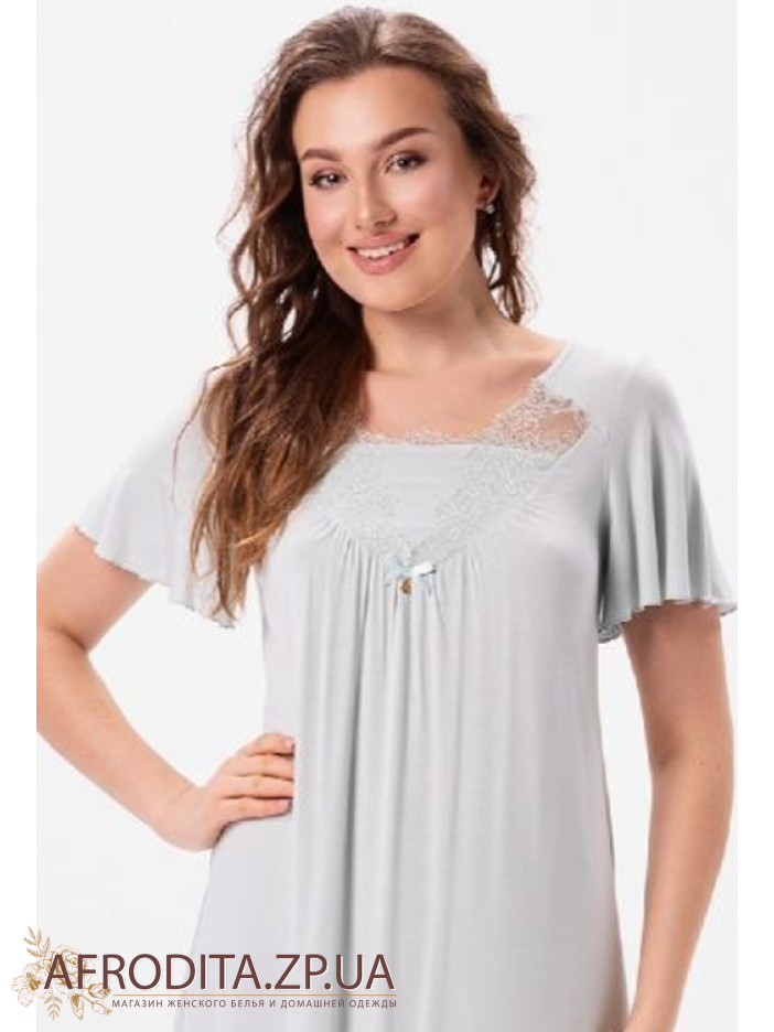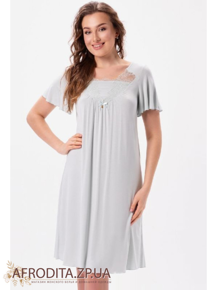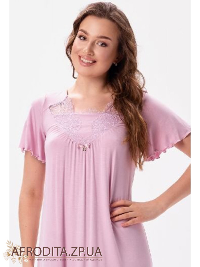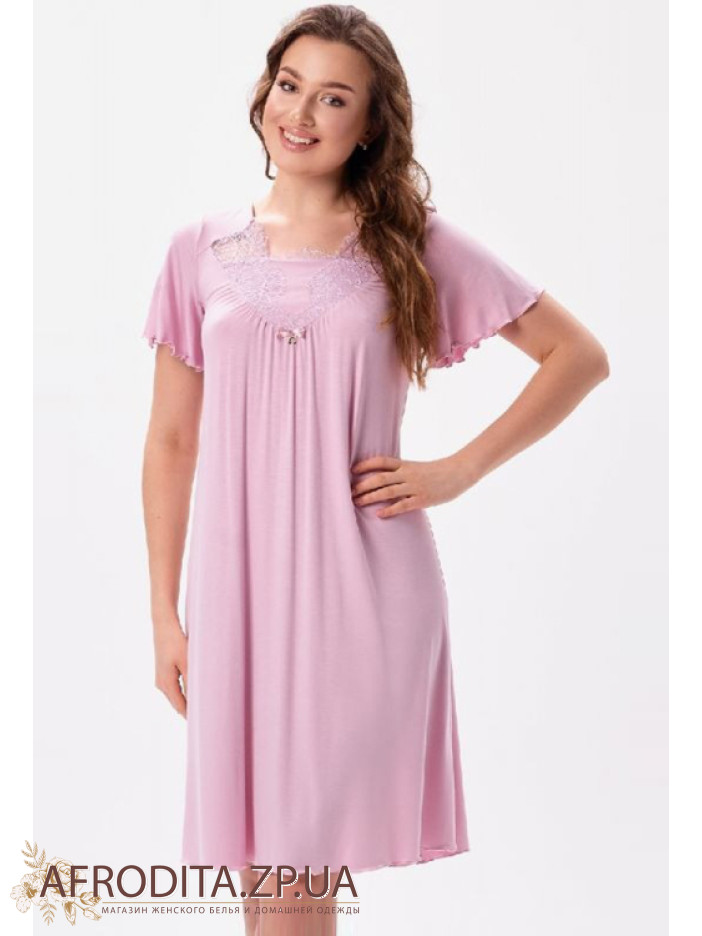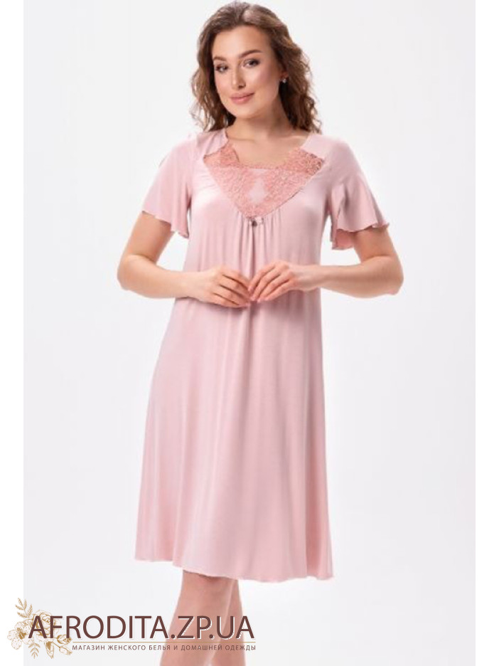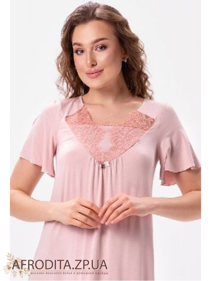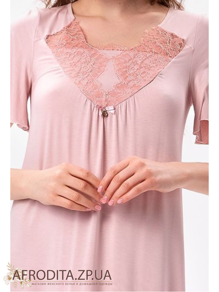 Чарівна нічнушка Shato з м'якої віскози ніжного пудрового відтінку дарує комфорт та легкість. Вільний силует і довжина трохи вище колін забезпечують зручну посадку, а оригінальний ліф із кокеткою та м'якими складками гарно підкреслює образ. Круглий виріз прикрашений ажурним мереживом та атласним бантиком з підвіскою, а рукави та низ оформлені декоративним хвилястим швом. Ідеальний вибір для комфортного сну і як витончений подарунок для близьких.