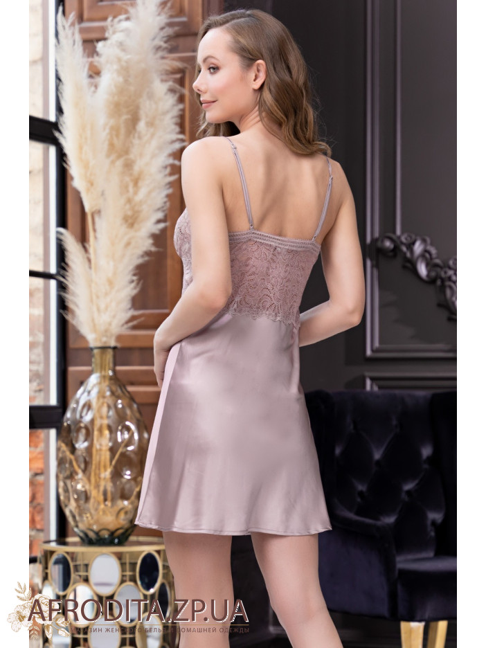 Сексуальна коротка сорочка Місті 7261 від Mia-Amore на тонких бретелях, виготовлена з однотонного штучного шовку та мережива. По центру вирізу сорочки розташований атласний бантик із кристалом Swarovski.