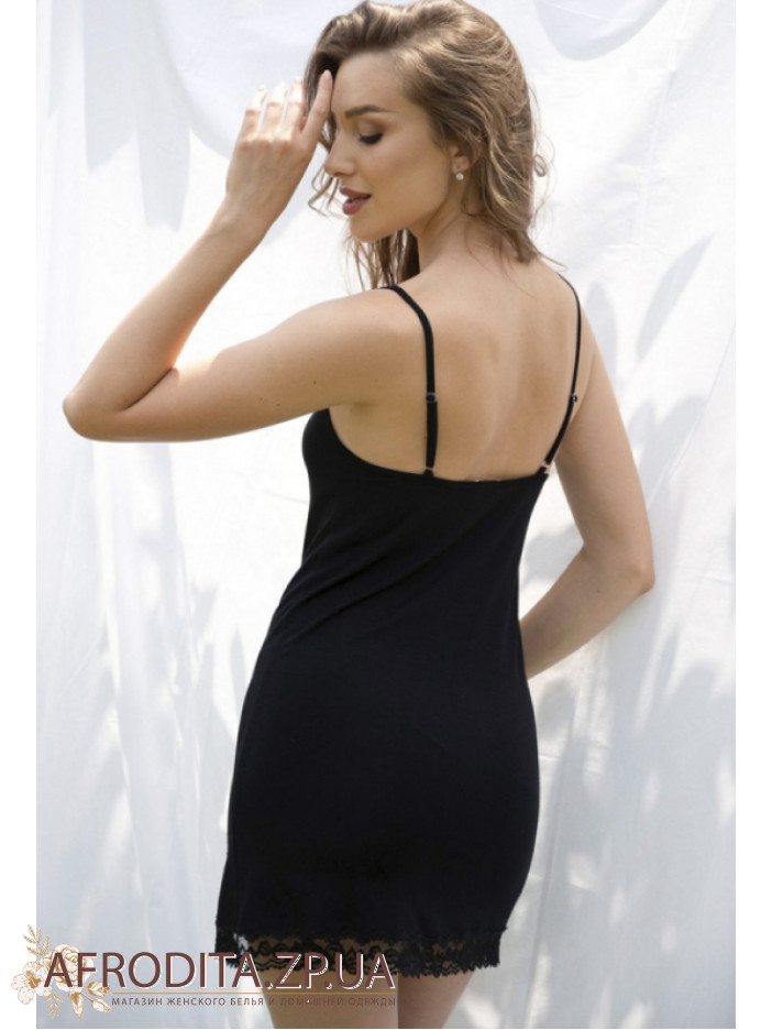 Сексуальна нічнушка Shato з м'якої чорної віскози підкреслює фігуру та дарує комфорт. Облягаючий силует, V-подібне декольте і витончений розріз додають образу чуттєвості, а тонкі бретелі, що регулюються, забезпечують ідеальну посадку. Ажурне мереживо по вирізу та низу та атласний бантик з підвіскою створюють ефектний акцент. Ідеальний вибір для особливих вечорів і як вишуканий подарунок.