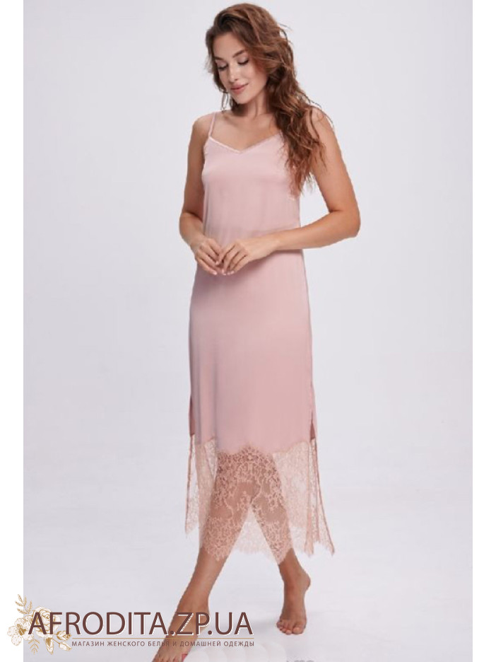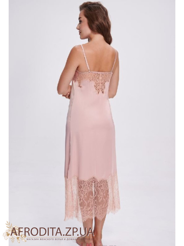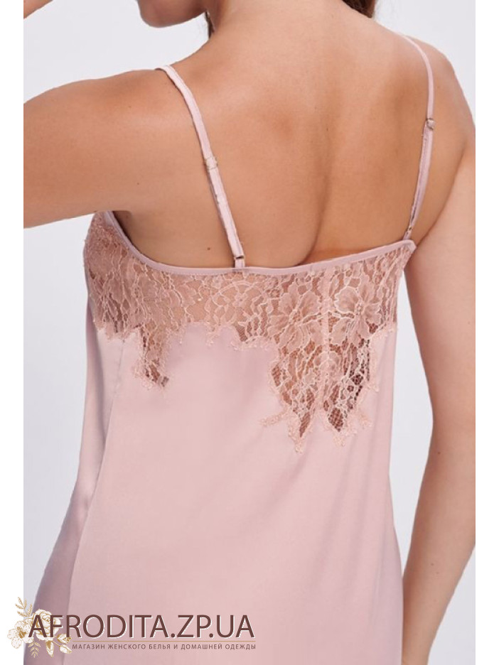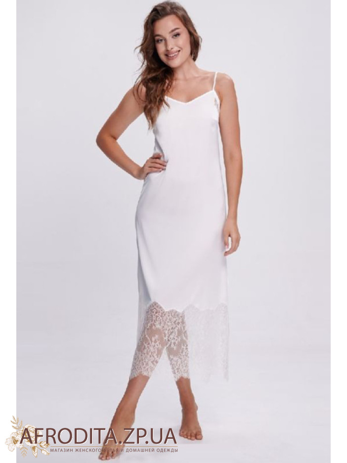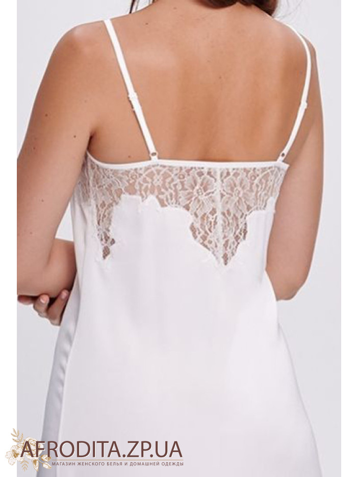 Елегантна нічнушка Shato 2702 пудра з м'якого шовку Armani білого кольору підкреслює витонченість та жіночність образу. Напівприлеглий силует довжиною нижче колін, тонкі регульовані бретелі та V-подібне декольте створюють ефектну посадку, а високі бічні розрізи додають чуттєвості. Ажурне мереживо на спинці і внизу надає моделі витонченого шарму. Ідеальний варіант для комфортного сну та як вишуканий подарунок.