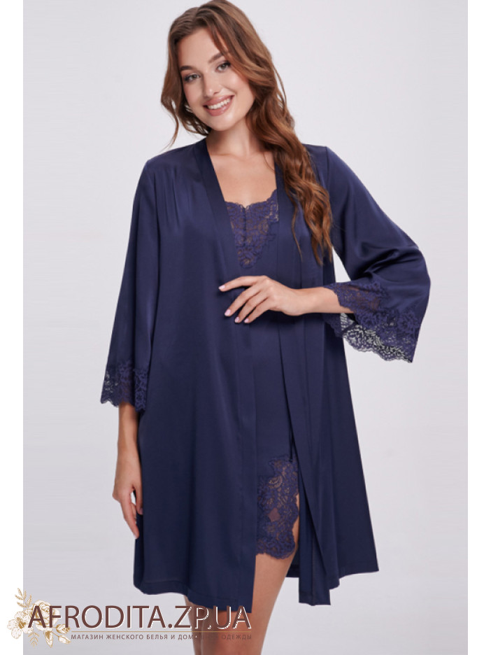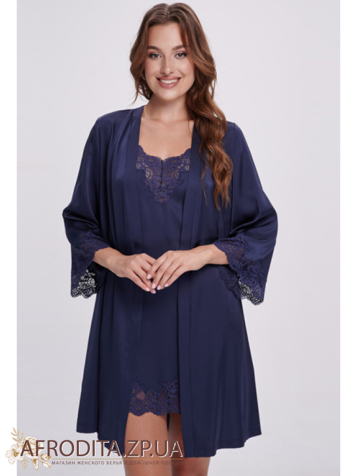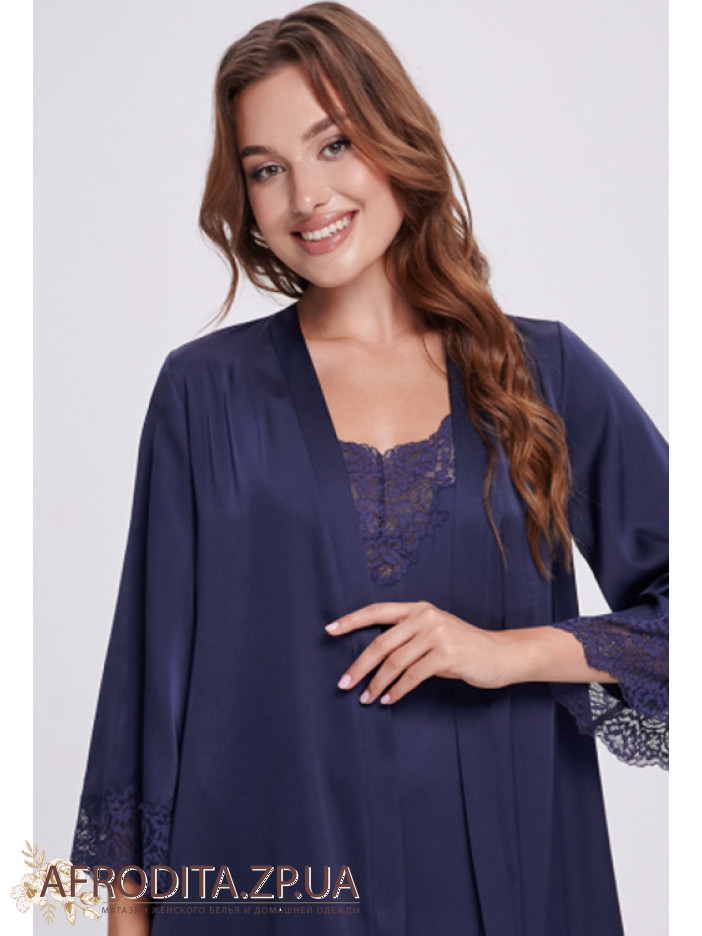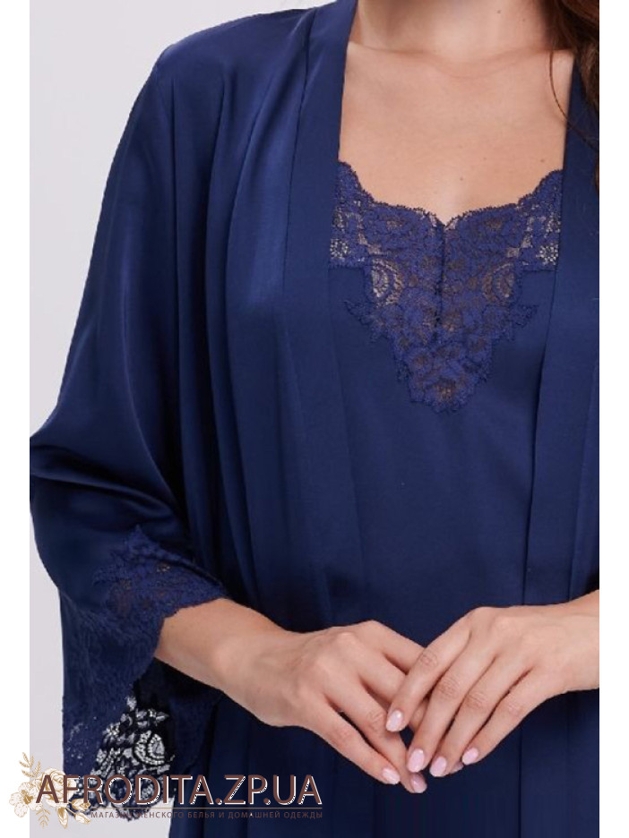 Жіночий халат Shato із м'якого шовку Armani темно-синього кольору – елегантний вибір для дому. Класичний крій довжиною вище колін підкреслює силует, а запах із поясом красиво акцентує талію. Рукави 3/4 з витонченими мереживними вставками надають образу легкість та романтичність. Комфортний, стильний і ідеальний як подарунок для близької людини.