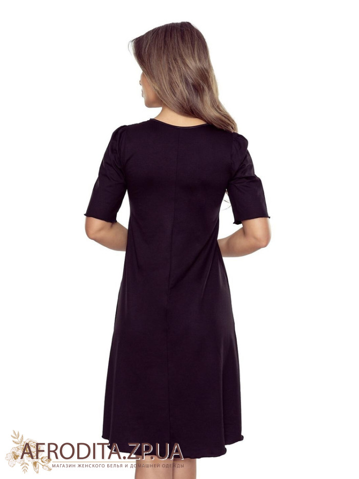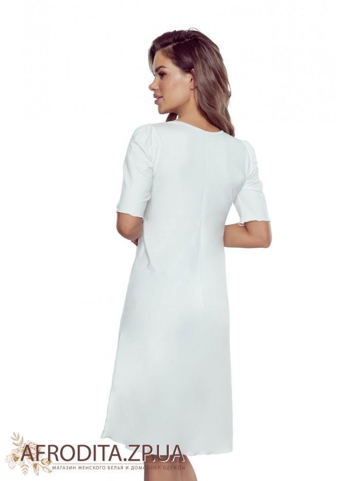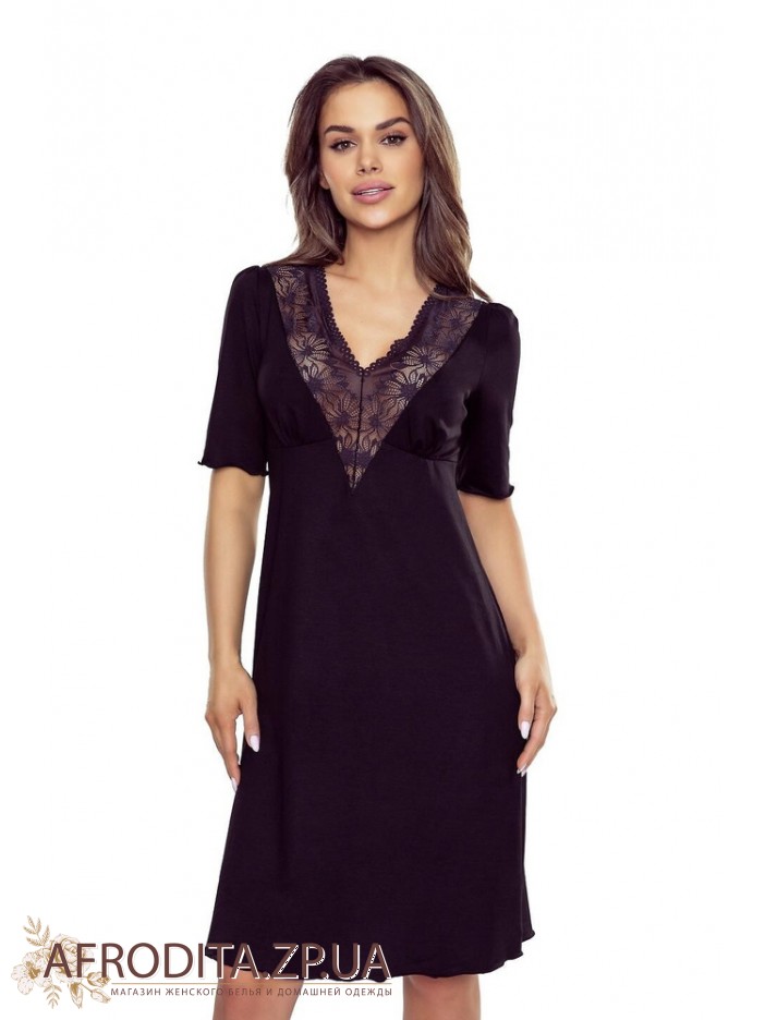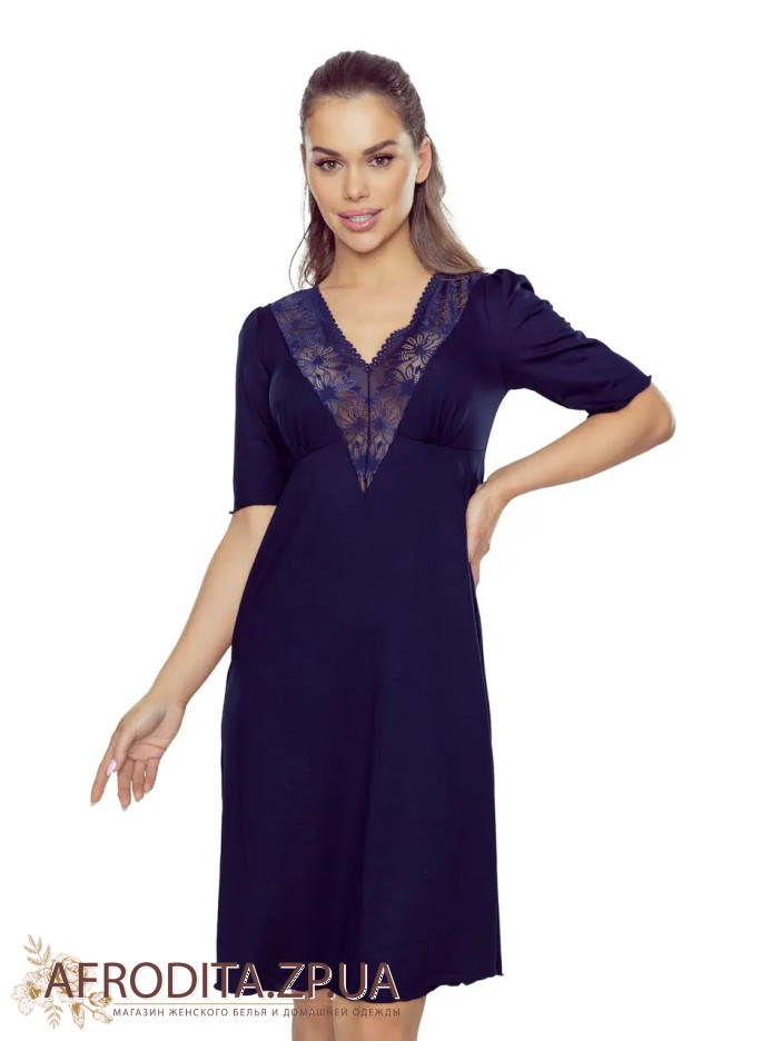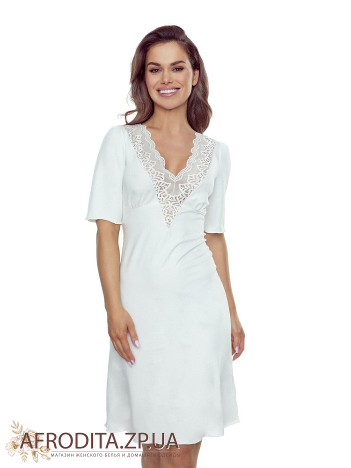 Жіноча сорочка з віскози від польського бренду Eldar. Сорочка з короткими рукавами довжиною вище колін. Глибокий виріз декольте прикрашений ажурним мереживом. Модель представлена в білому, чорному та синьому кольорах, виглядає стильно та елегантно, може бути гарною ідеєю для подарунка близьким вам людям.