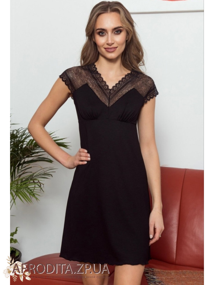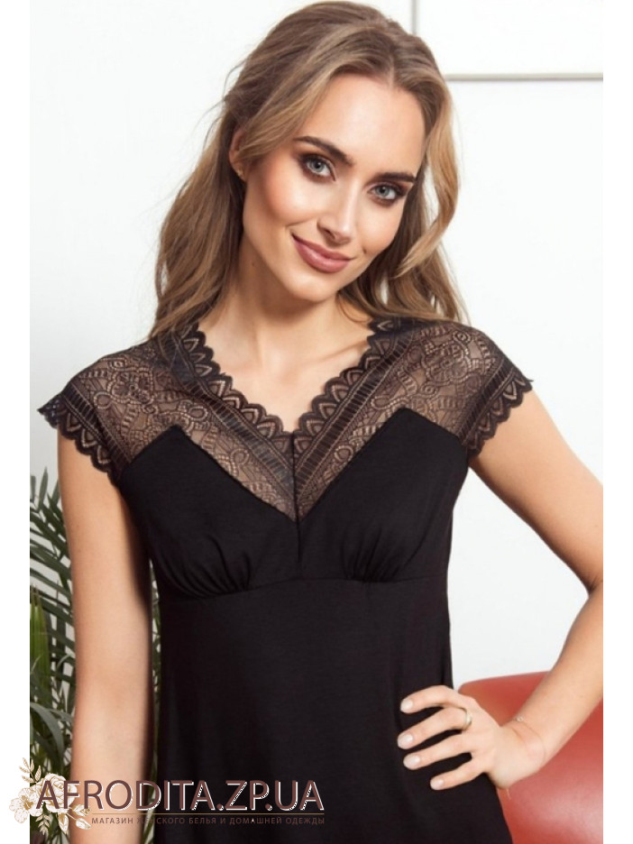 Рубашка жіноча з віскози Eldar 234373 від польської марки. Сорочка вище колін з підрізом під грудьми, V-подібний виріз декольте та трохи приспущені плечі прикрашені напівпрозорим мереживним полотном. Спинка моделі також декорована мереживом кольору виробу. Тканина м'яка та дуже приємна до тіла.