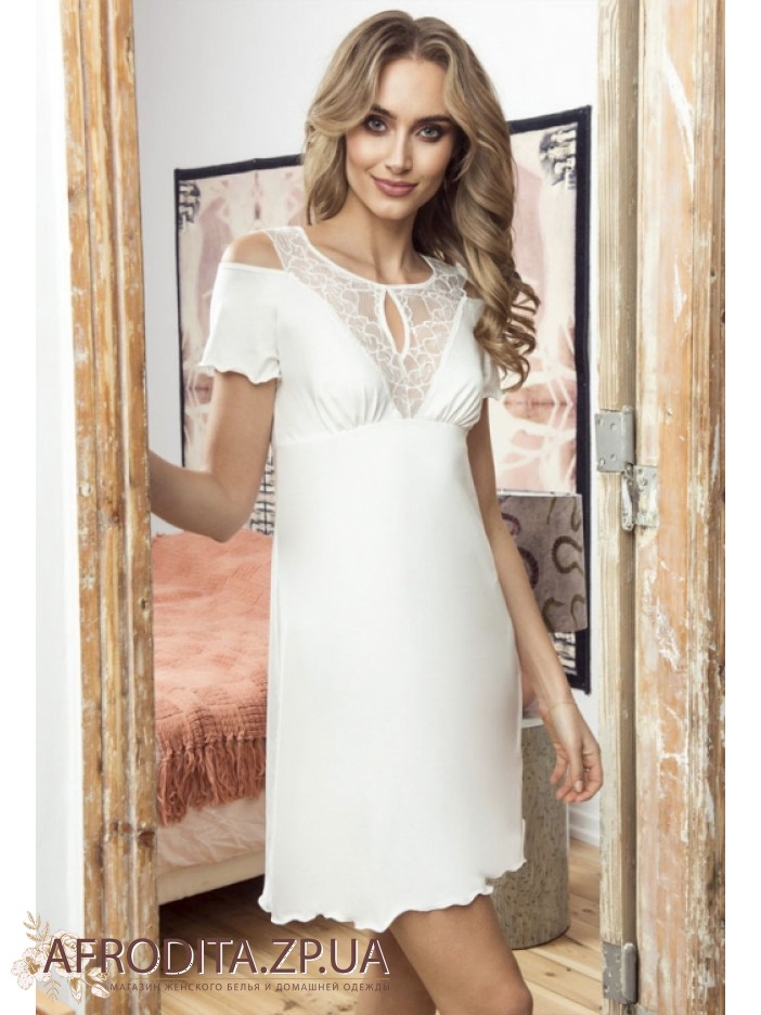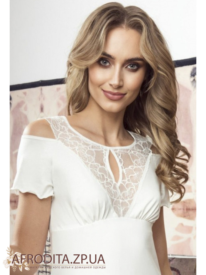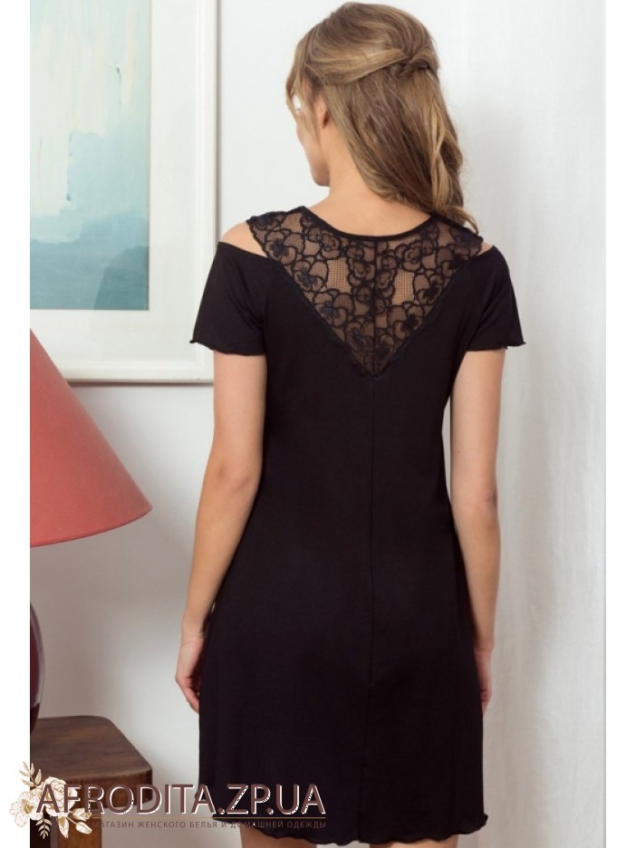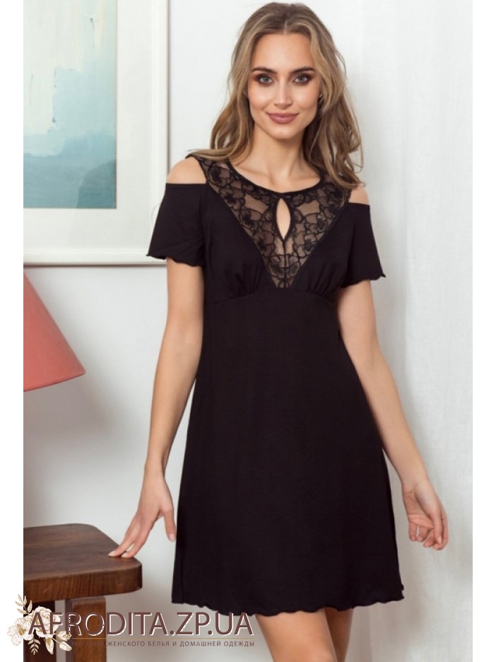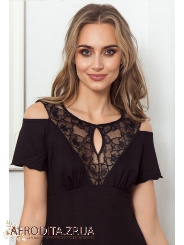 Жіноча нічна сорочка Eldar 234377 з м'якої віскози у трьох популярних кольорах, чорний, білий та червоний. Модель з короткими рукавами вище колін з підрізом під грудьми. Горловина має округлу форму, на рукавах та області декольте розташовані спокусливі розрізи. Зона ліфа і спинка прикрашені мереживним полотном в колір сорочки. Модель виглядає дуже елегантно і відмінно підійде як подарунок вашій близькій людині.