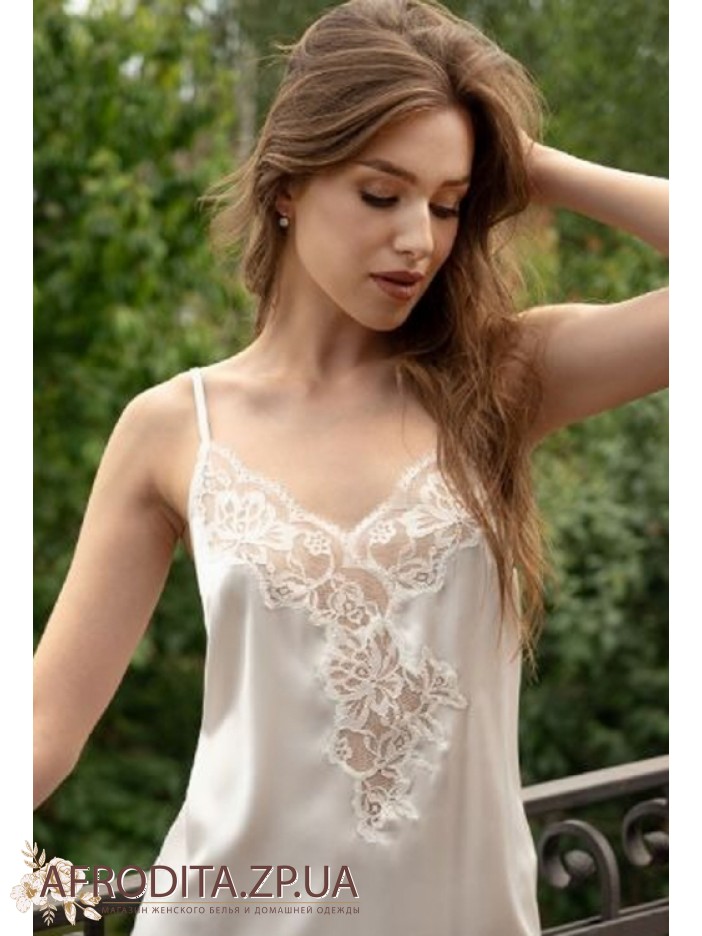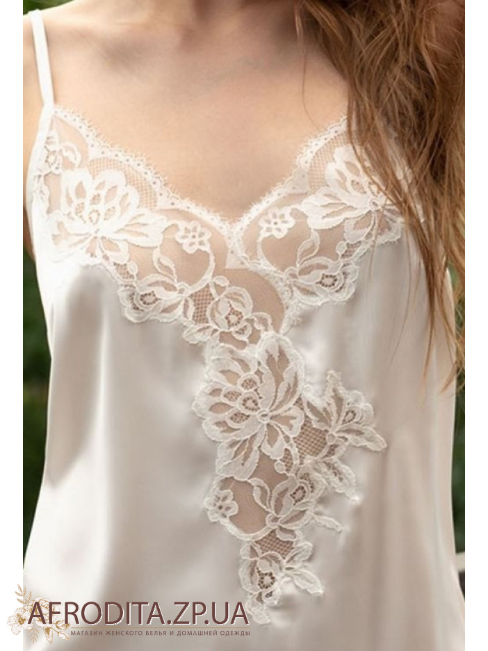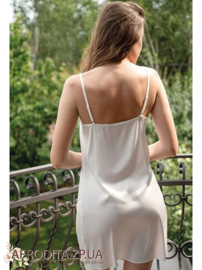 Жіноча нічна сорочка Shato 2302 виготовлена ​​із атласного шовку. Сорочка вище колін на тонких бретелях, що регулюються. Глибокий виріз у ділянці декольте прикрашений мереживом.