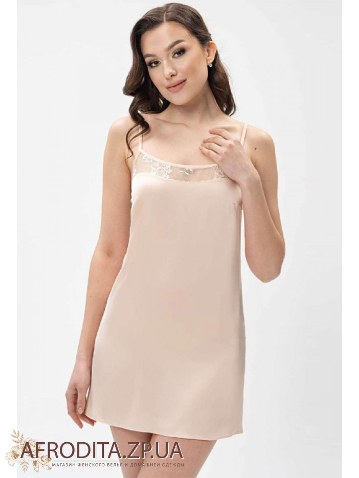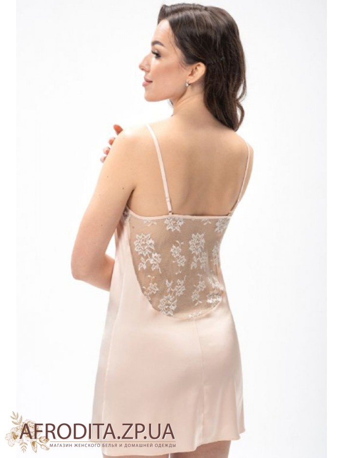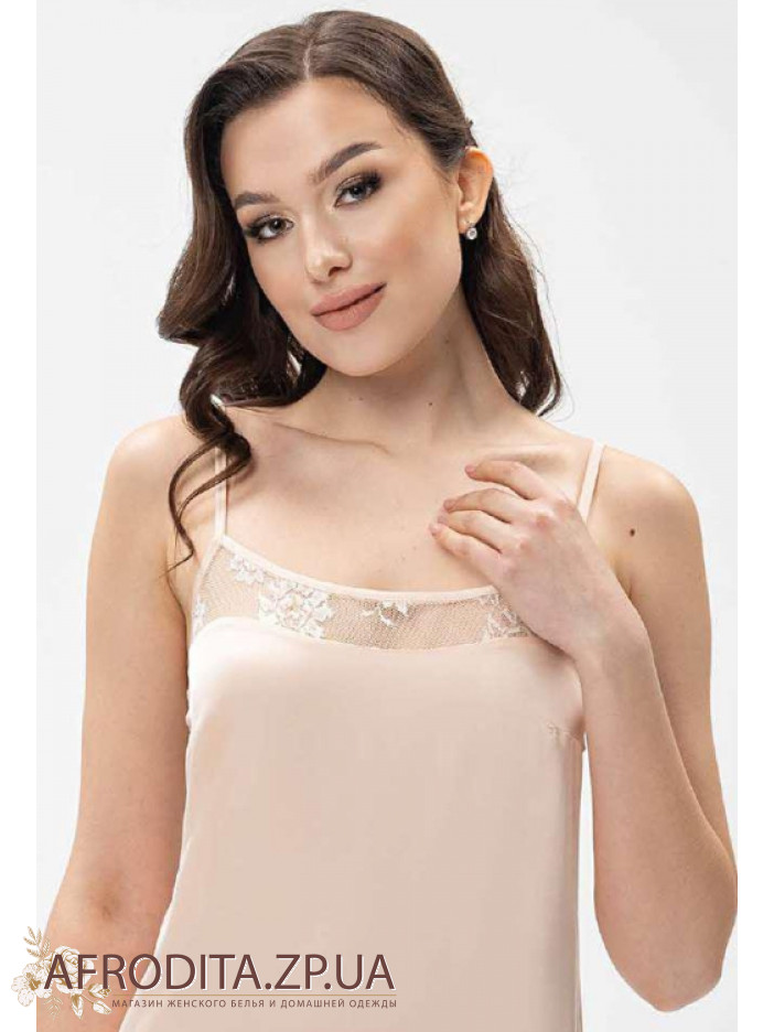 Жіноча нічна сорочка Shato 2404 із атласного шовку. Рубашка на тонких бретелях, що регулюються, без підрізу під грудьми. Декольте округлої форми декороване мереживом, спинка також прикрашена напівпрозорим мереживним полотном.
