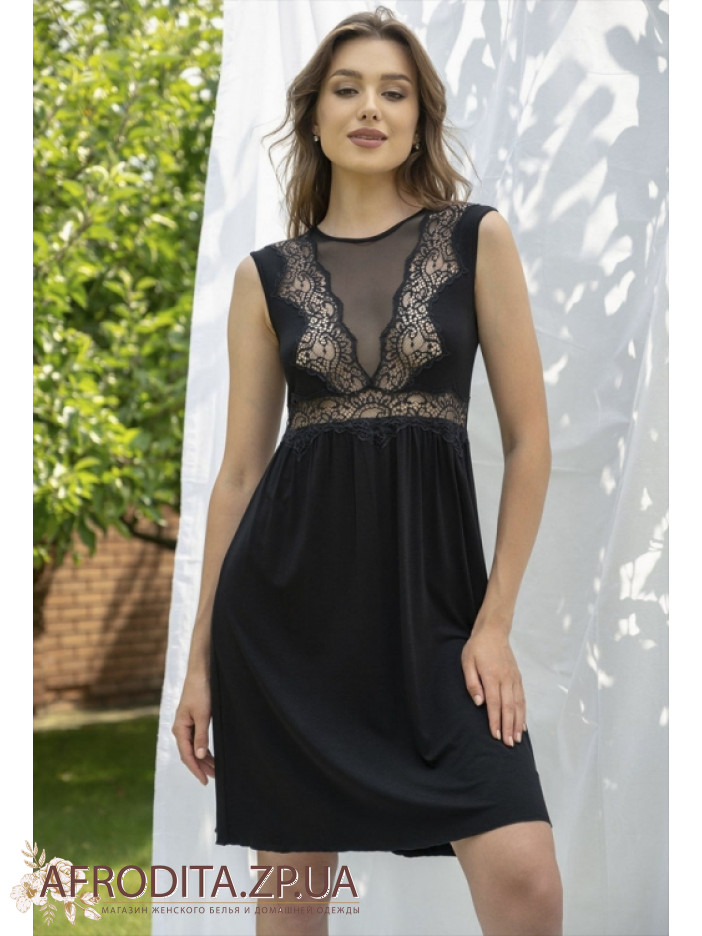 Жіноча нічна сорочка Shato 2315 вище колін виготовлена з м'якої віскози чорного кольору. Модель з округлим вирізом горловини, область декольте декорована напівпрозорою сіткою і мереживом. Область талії також прикрашена мереживом.