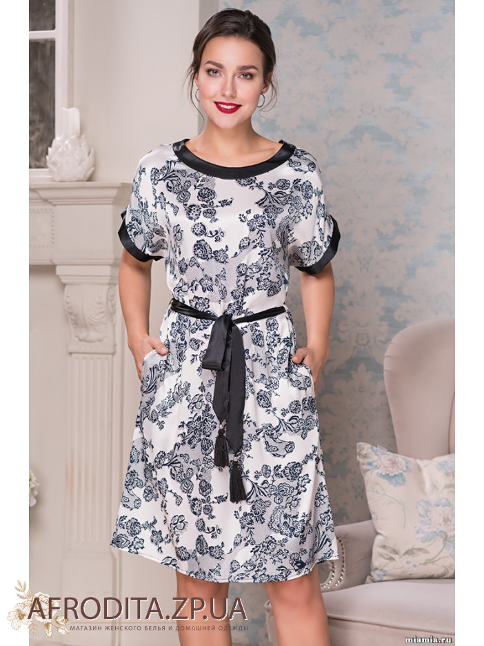Домашня туніка вище колін "Пауліна" 8145 від Mia-Mella з коротким рукавом і виготовлена ​​з атласної шовку. Рукава і горловина декоровані чорним кантом. З боків вироби розташовані кишені. Склад: 100% поліестер.