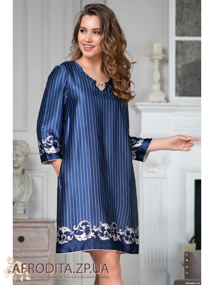 Оригінальна жіноча туніка "Бароко" 8614 від італійського бренду Mia-Amore з однотонного атласного шовку синього кольору в смужку. Низ туніки і краю рукавів прикрашені білим малюнком. Вгорі вироби по центру розташована оригінальна підвіска. З боків розташовані кишені. У комплекті додається пояс. Склад: 100% поліестер.