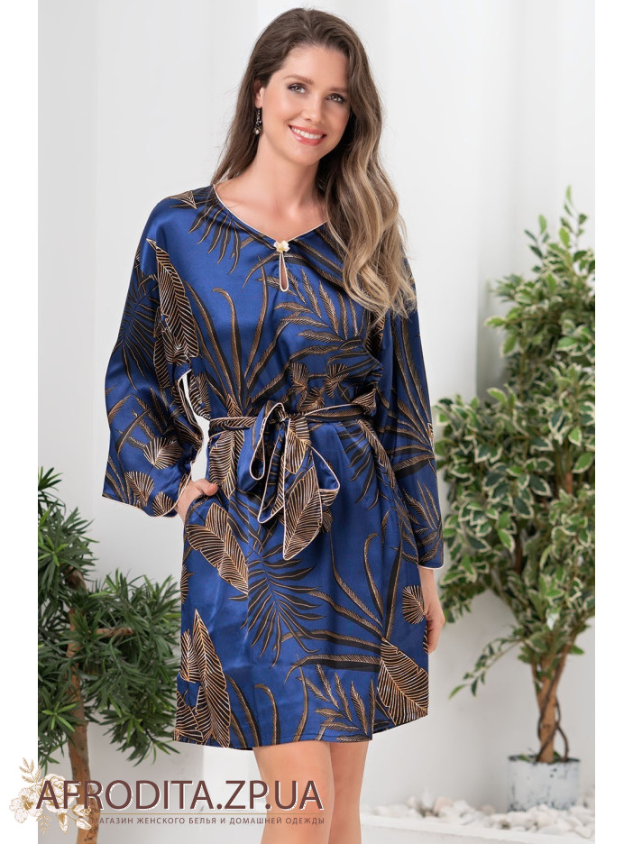 Коротка туніка Mia-Amore з рукавами довжиною 3/4 виготовлена з штучного шовку. Рукави внизу, виріз горловини, пояс декоровані золотим атласним кантом. У бокових швах кишені.