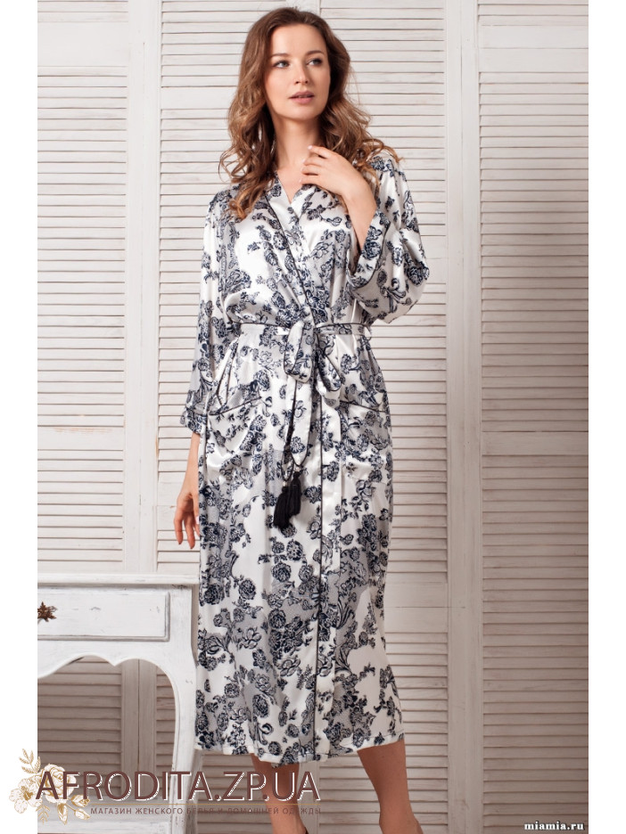 Довгий халат "Пауліна" 8169 від Mia-Mella виготовлений з атласної шовку. Халат на запах з бічними кишенями, Оригінальний пояс з китицями на кінцях надає неповторну родзинку виробу. Склад: 100% поліестер.