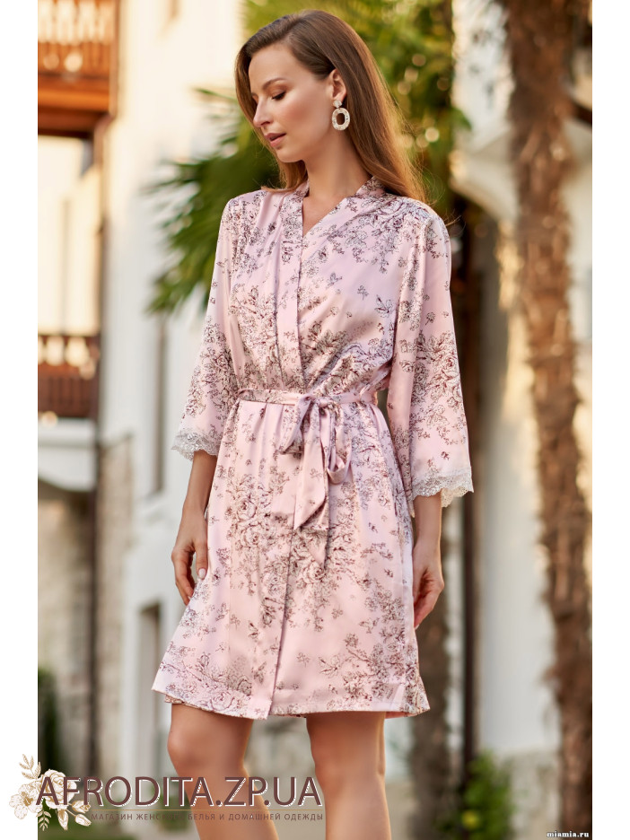 Жіночий халат вище колін "Розмарі" 8693 виготовлений з атласної шовку. Халат на запах і зав'язується на пояс. Краї рукавів декоровані мереживом. З боків розташовані кишені. Халат можна укомплектувати нічний сорочкою 8690.