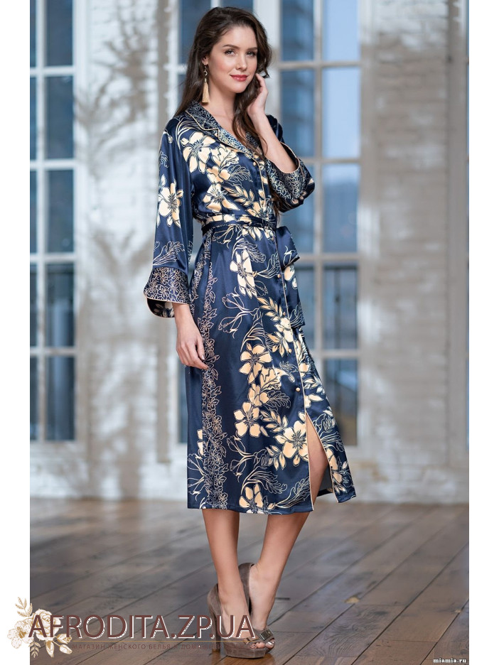 Довгий халат "Да Вінчі" від Mia-Amore зі штучного принтованого шовку. Борти халата, притачной широкі манжети на рукавах 7/8 декоровані тонким витонченим кантом. У комплекті йде пояс. Склад 100% поліестер