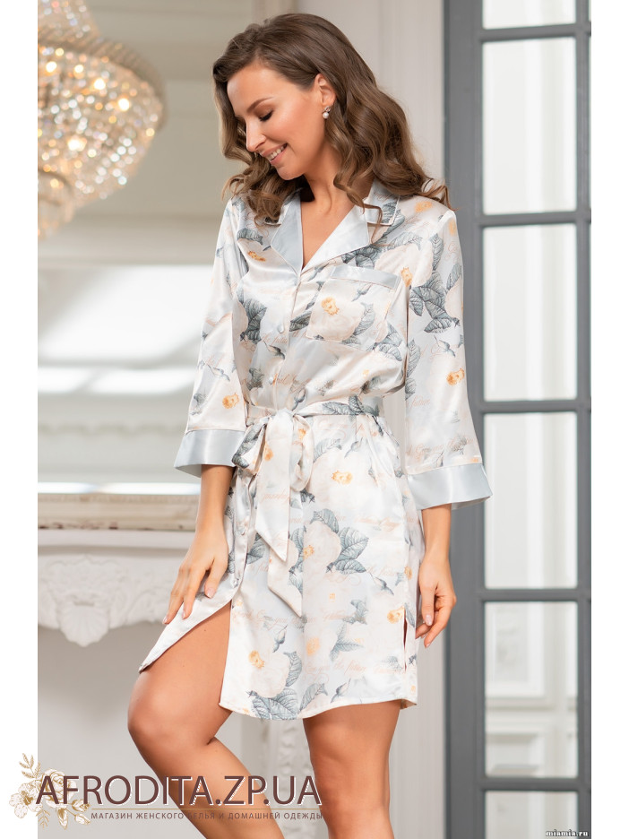 Сорочка Mia-Amore з рукавом довжиною 3/4. Виконана з принтованого атласу з однотонною обробкою і контрастними кантами. У бічних швах оброблені кишені. Лінію талії можна підкреслити за рахунок пояса, який йде в комплекті.