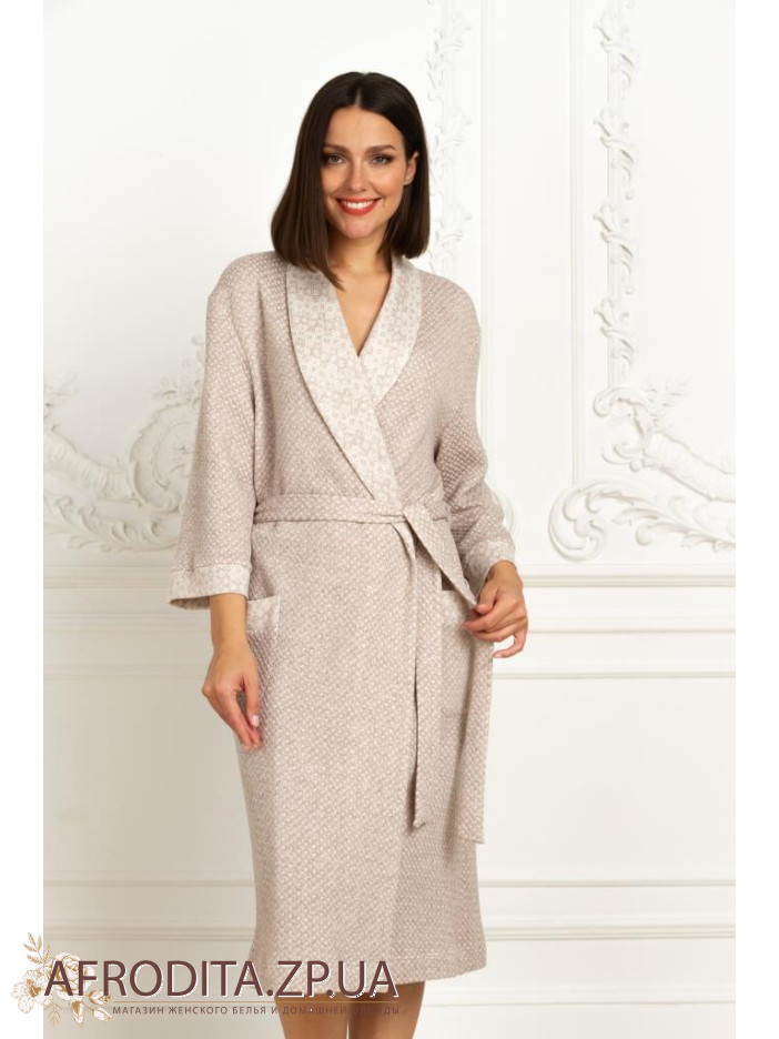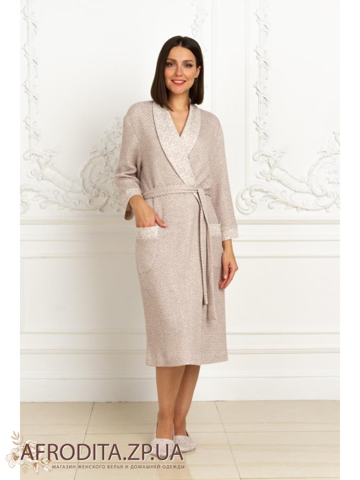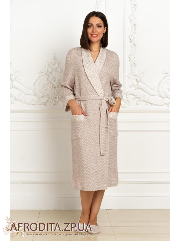 Теплий жіночий халат на запах "Emmi" виготовлений з Капітонія кавового кольору. З боків розташовані накладні кишені.