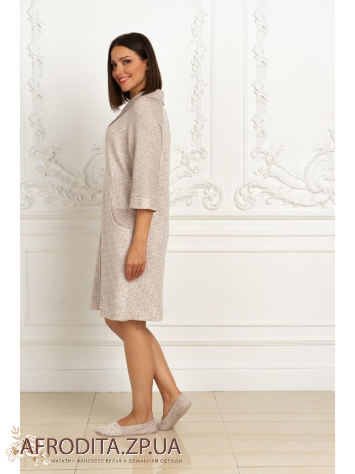Теплий жіночий халат "Emmi" з відкладним коміром з Капітонія. Халат застібається на блискавку, з боків розташовані кишені.