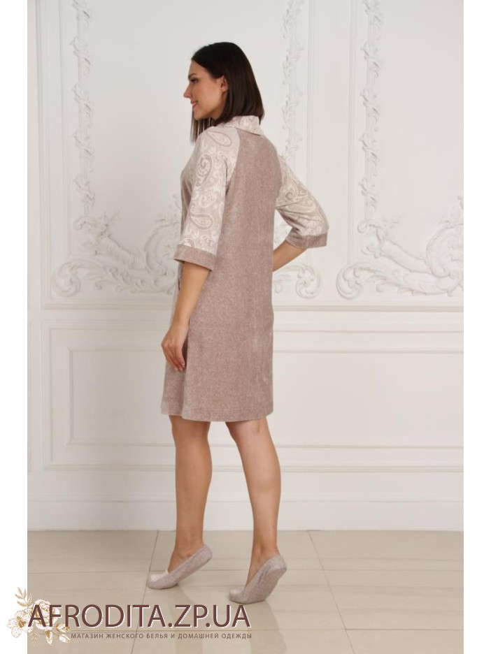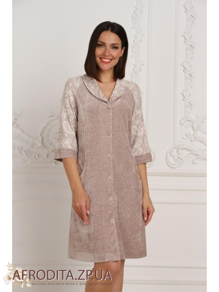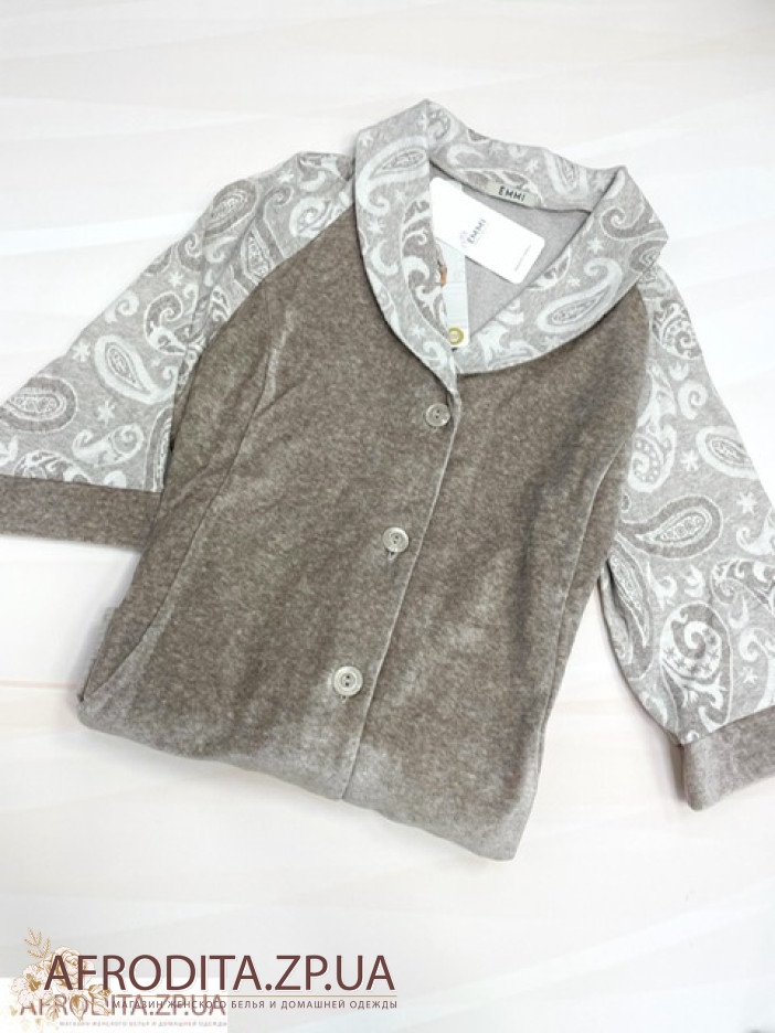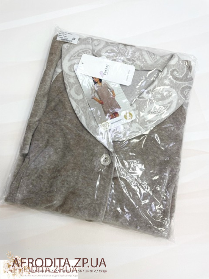 Теплий жіночий халат "Emmi" виготовлений з велюрової тканини. Довжина рукава 3/4. Халат застібається на гудзики, з боків розташовані кишені.