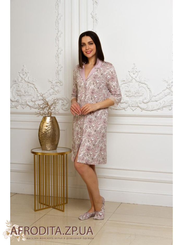 Жіночий домашній халат "Emmi" 78127 виготовлений з м'якої і дуже приємною до тіла віскози з додаванням еластану. Халат до колін і застібається на гудзики. Комір декорований манжетом, краї рукавів декоровані ніжним мереживом.