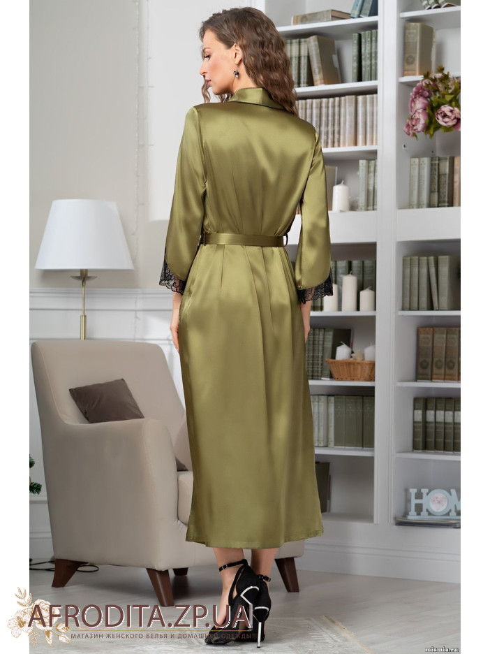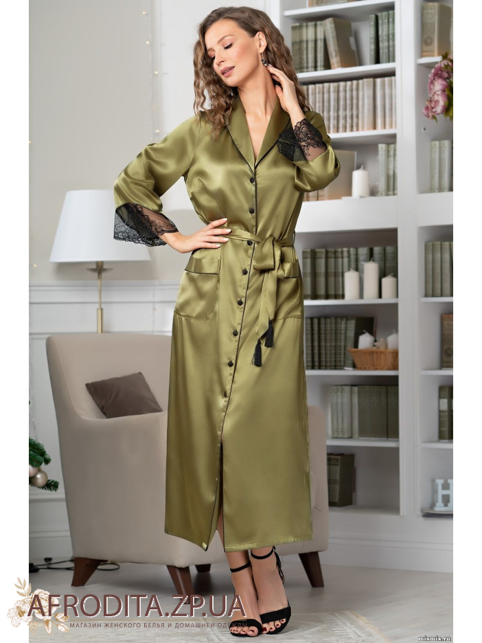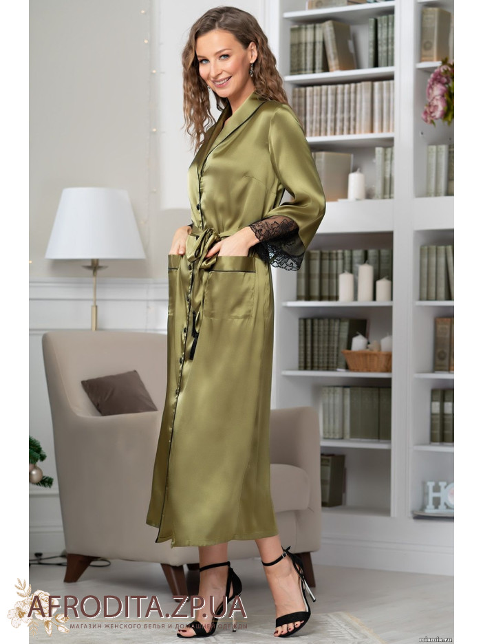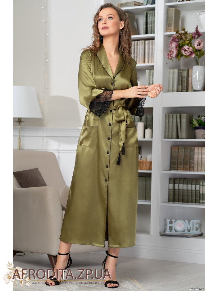 Елегантний довгий халат Mia-Amore на ґудзиках та з відкладним коміром із однотонного сумішевого шовкового полотна. Низ рукавів ¾ декорований мереживом. Лінію борту та накладні кишені прикрашають тонкі контрастні канти. Пояс прикрашений декоративними пензликами.
