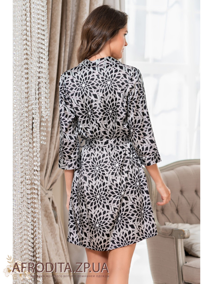 Сорочка Mia-Amore довжиною до колін з рукавами довжиною ¾, із центральною застібкою на гудзики виконана з штучного принтованого шовку. Борт, комір, рукави та кишеня сорочки оздоблені білим кантом. У комплект до сорочки йде пояс. У бокових швах кишені.