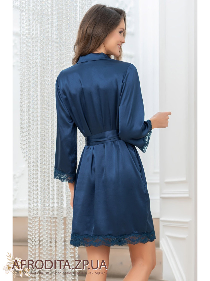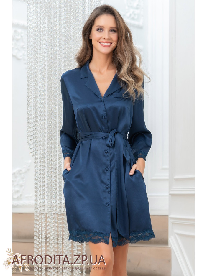 Короткий халат Mia-Amore на гудзиках з рукавом довжиною 7/8, виконаний з однотонного шовку суміші і декорований мереживними вставками по низу рукавів і низу виробу. У бічних швах оброблено кишені. Лінію талії можна підкреслити за рахунок широкого поясу, що йде у комплекті.