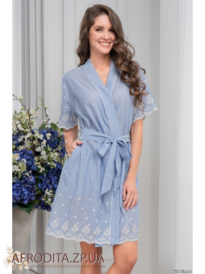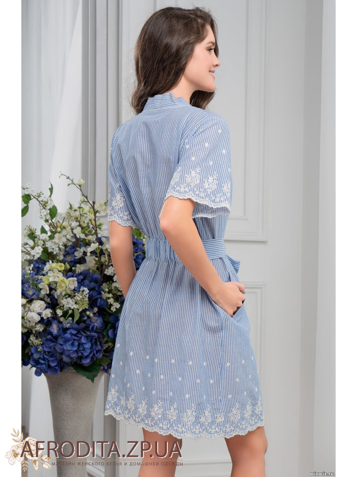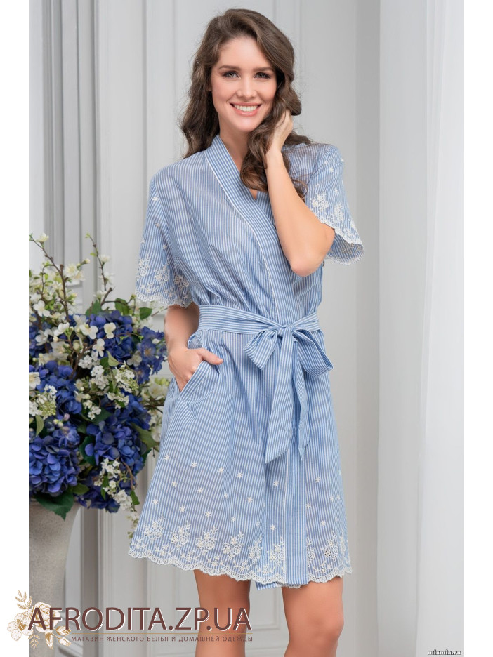 Короткий халат "Ніцца" 6713 від Mia-Amore з натуральної бавовни в блакитну смужку. Уздовж планки на лінії борту декоративний кант. З боків прорізні кишені у рамку. Короткі рукави та низ халату декоровані вишивкою молочного кольору. Спинка халата з накладною деталлю в ділянці талії, з гумкою всередині, переходить у притачний пояс.Склад 100% бавовна