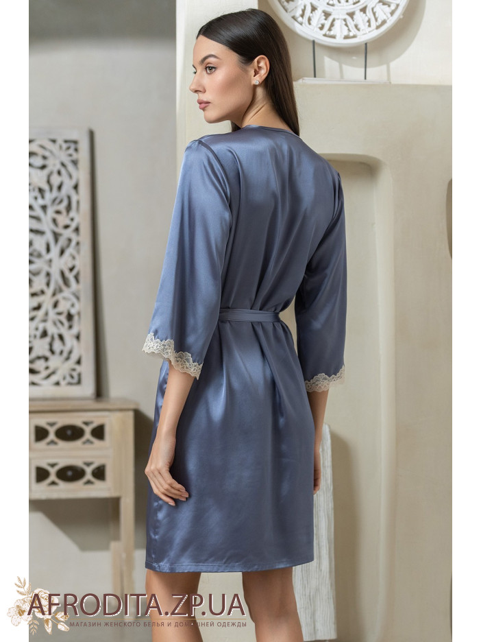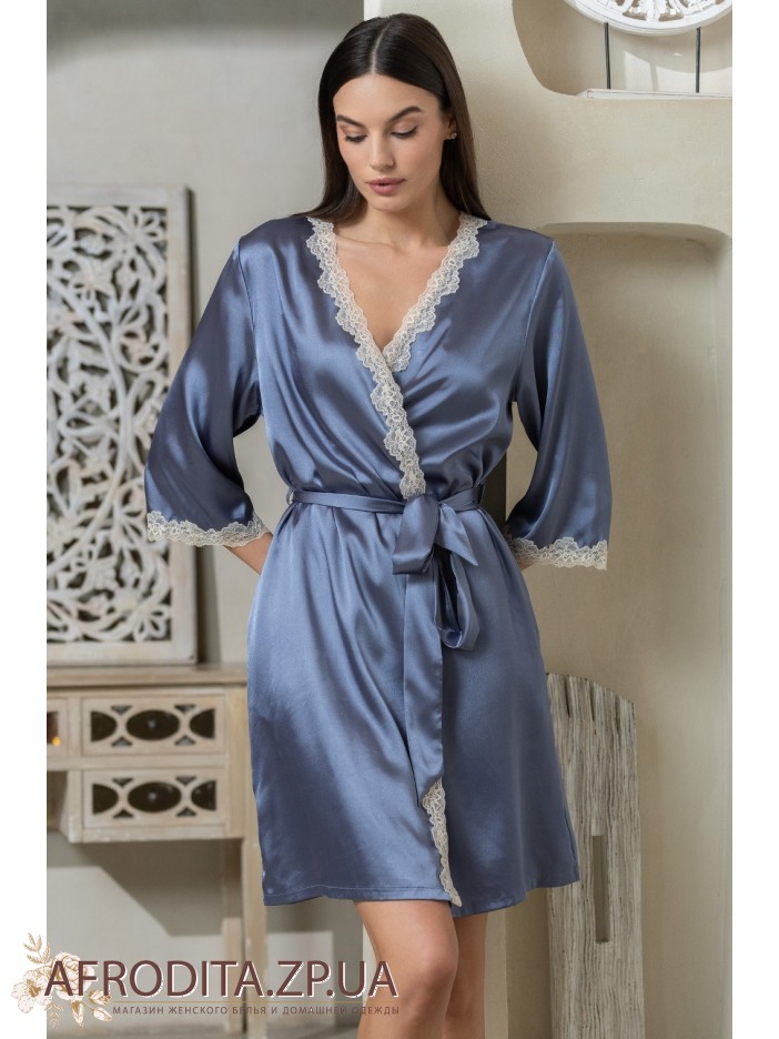 Короткий халат "Джулія" 8733-4 Mia-Mella з рукавами 3/4 виготовлений зі штучного шовкового полотна з атласним блиском. Рукави та борти халату декоровані витонченим мереживом. Халат на запаху з поясом, у бічних швах є кишені.