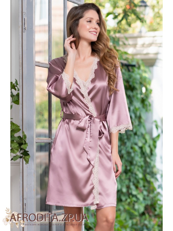 Короткий халат "Джулія" 8733-5 Mia-Mella з рукавами 3/4 виготовлений зі штучного шовкового полотна з атласним блиском. Рукави та борти халату декоровані витонченим мереживом. Халат на запаху з поясом, у бічних швах є кишені.